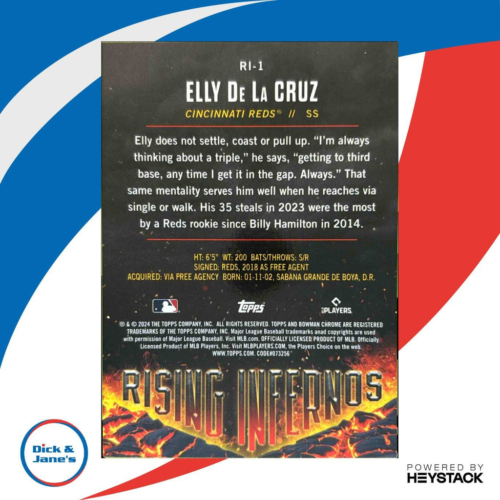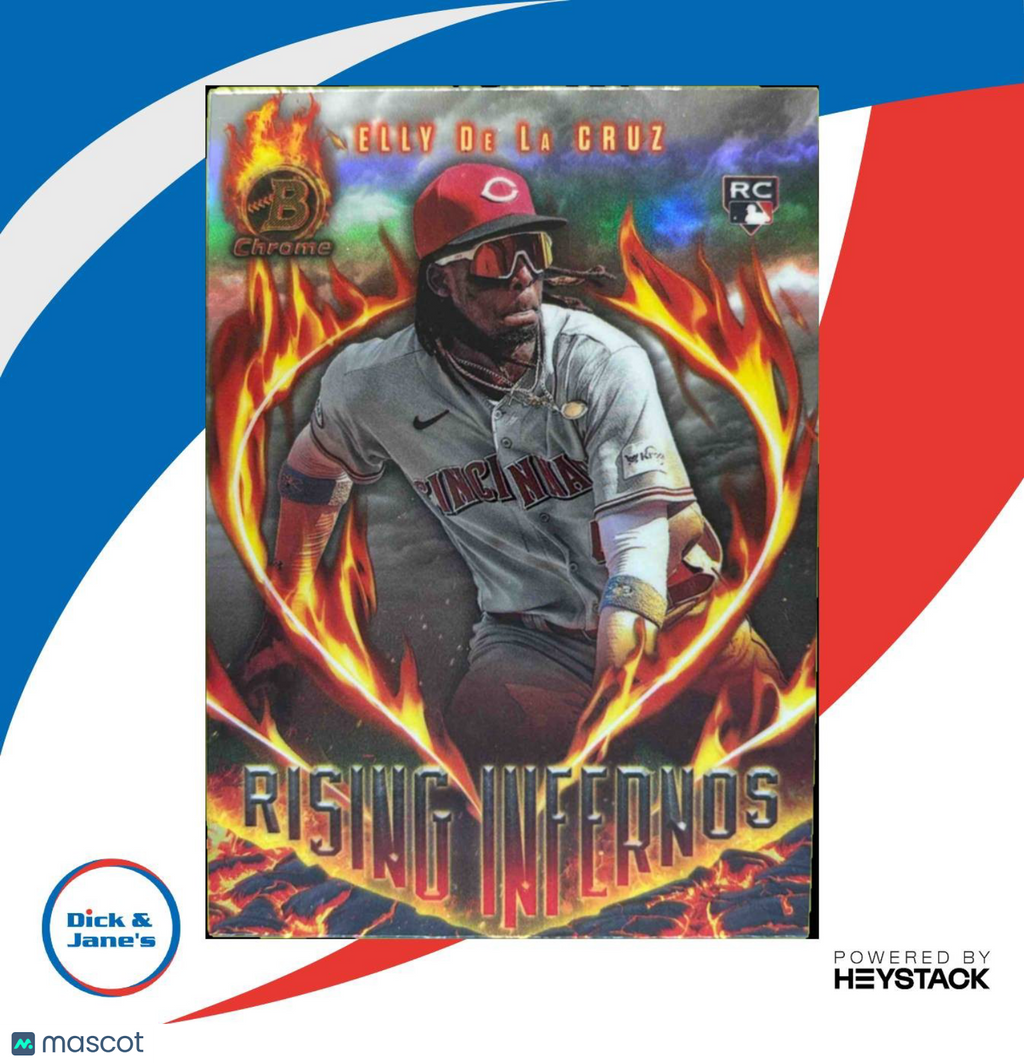 Collect the highly sought after 2024 Bowman Elly De La Cruz Rising Infernos #RI-1 RC trading card featuring the rising star from the Cincinnati Reds. This MLB rookie card is a must-have for serious collectors and fans alike. Don't miss out on adding this valuable piece to your collection today! Listed With Mascot.