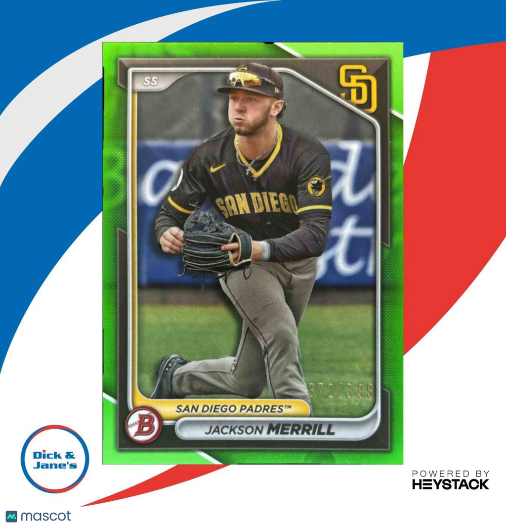 The 2024 Bowman Jackson Merrill Prospects Neon Green trading card features the rising star from the San Diego Padres. Limited edition #BP-145 card with only 399 made. A must-have for any MLB card collector looking to add a unique and valuable piece to their collection. Listed With Mascot.