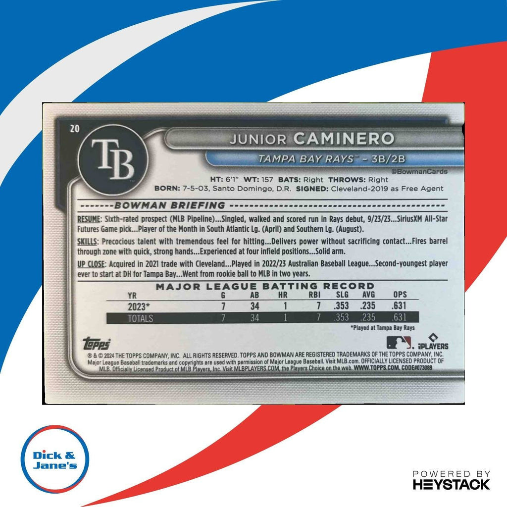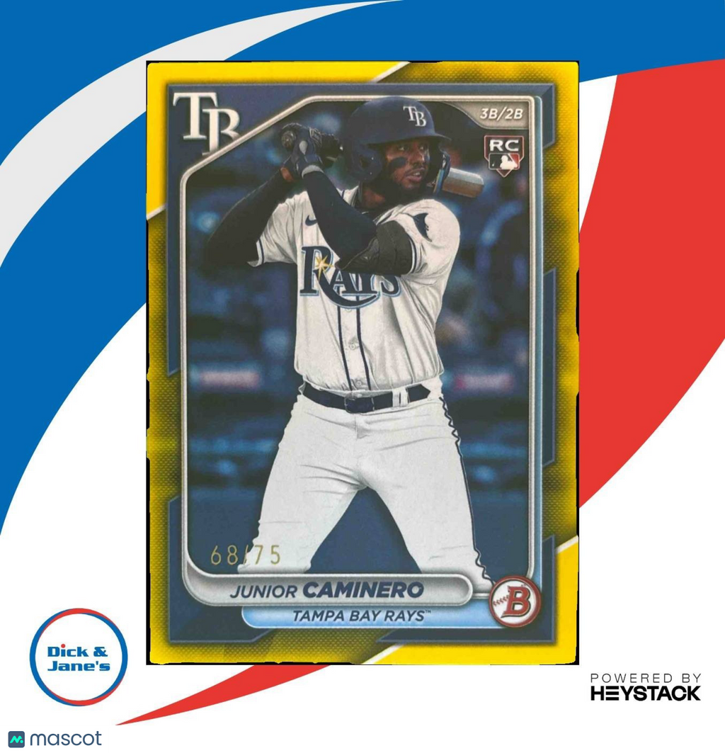 Own a piece of baseball history with the 2024 Bowman Junior Caminero Yellow #20 RC trading card! This limited edition card features the up-and-coming talent from the Tampa Bay Rays, with only 75 in existence. Don't miss your chance to add this rare collectible to your sports card collection today. Listed With Mascot.