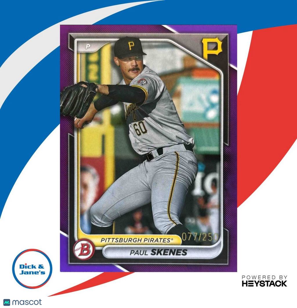 The 2024 Bowman Paul Skenes Prospects Purple trading card is a limited edition collectible featuring up-and-coming Pittsburgh Pirates player. Numbered 77 out of 250, this card is a must-have for any baseball card collector. Don't miss your chance to own a piece of MLB history! Listed With Mascot.