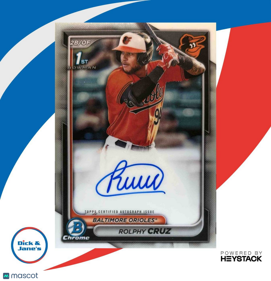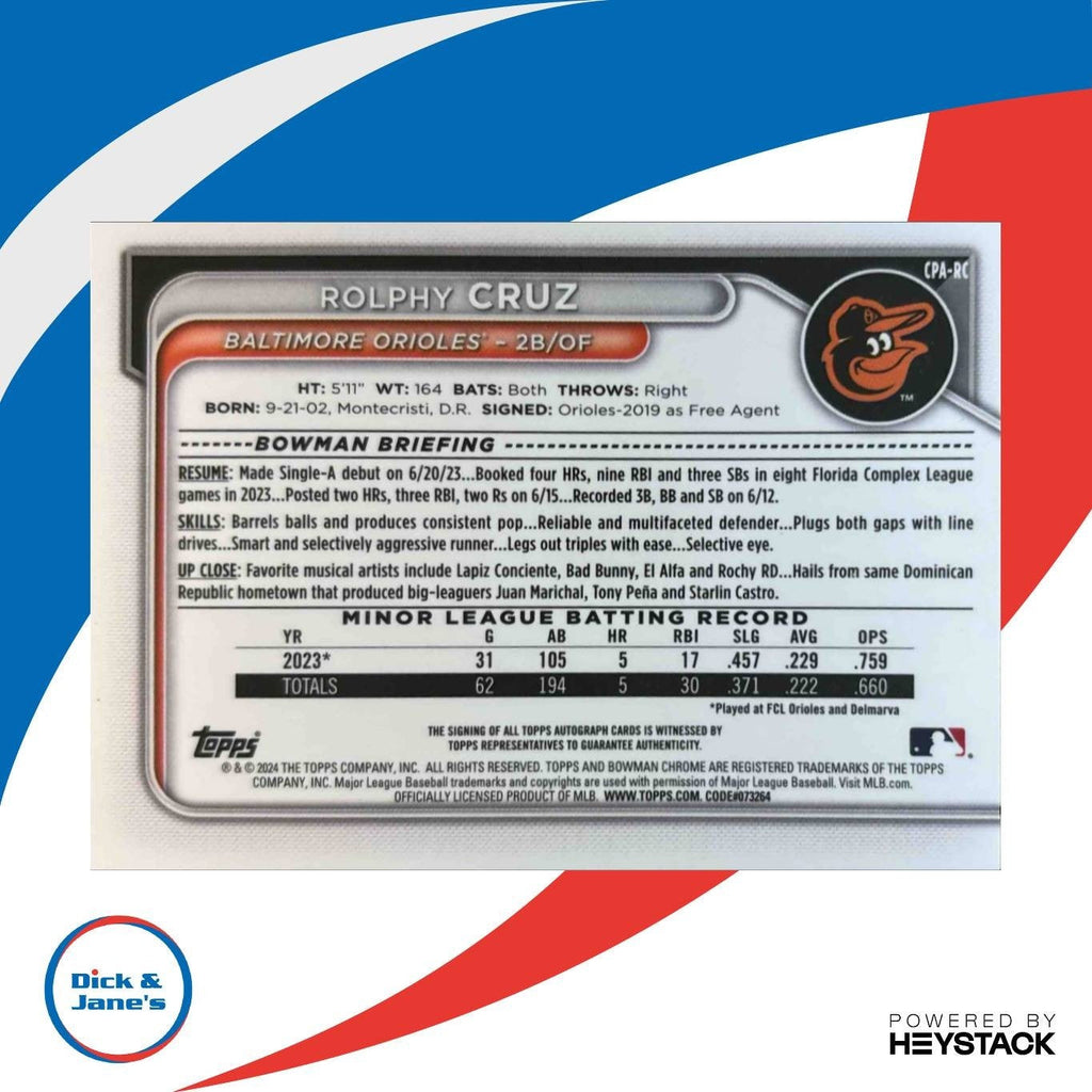 Get your hands on the highly sought-after 2024 Bowman Rolphy Cruz Chrome Auto #CPA-RC 1st Prospect card of the Baltimore Orioles. As a 1st Prospect Auto card, this MLB collectible is a must-have for any sports trading card enthusiast. Don't miss out on adding this valuable piece to your collection! Listed With Mascot.