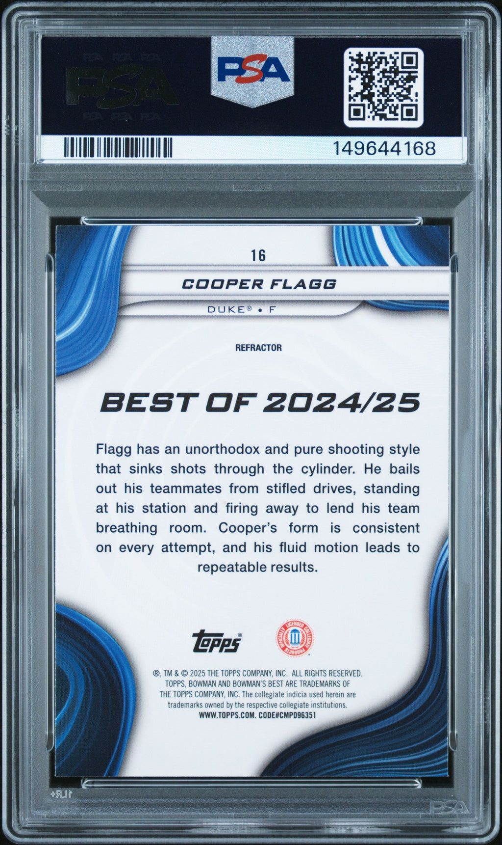 2024 Bowman University Best Cooper Flagg Refractor Rookie #16 PSA 10 Duke Blue Devils Don’t miss your chance to own this stunning 2024 Bowman University Best Cooper Flagg Refractor Rookie card, graded a perfect PSA 10! 🌟 Cooper Flagg, the breakout sensation of 2024 and a top prospect for the Duke Blue Devils, is making headlines across the basketball world. This highly sought-after rookie card is a must-have for serious collectors and fans looking to invest in the future of basketball. With zero cards graded higher and only 51 in the population, this gem stands out as a true centerpiece for any collection. Featuring the eye-catching Refractor parallel and the official PSA certification, this card showcases Flagg’s dynamic potential and rising stardom. 🏀 Secure this rare rookie card today and celebrate one of the most exciting young talents in college basketball before his value skyrockets! Perfect for Duke Blue Devils fans, prospectors, and collectors who demand the very best. Set: 2024 Bowman University Best Certification Number: 149644168 Grader: Professional Sports Authenticator (PSA) Grade: 10 Year Manufactured: 2024 Player/Athlete: Cooper Flagg Graded: Yes Population Higher: 0 Sport: Basketball Parallel/Variety: Refractor Manufacturer: Bowman Population: 51 Features: Rookie Team: Duke Blue Devils Card Number: 16 Listed With Mascot.