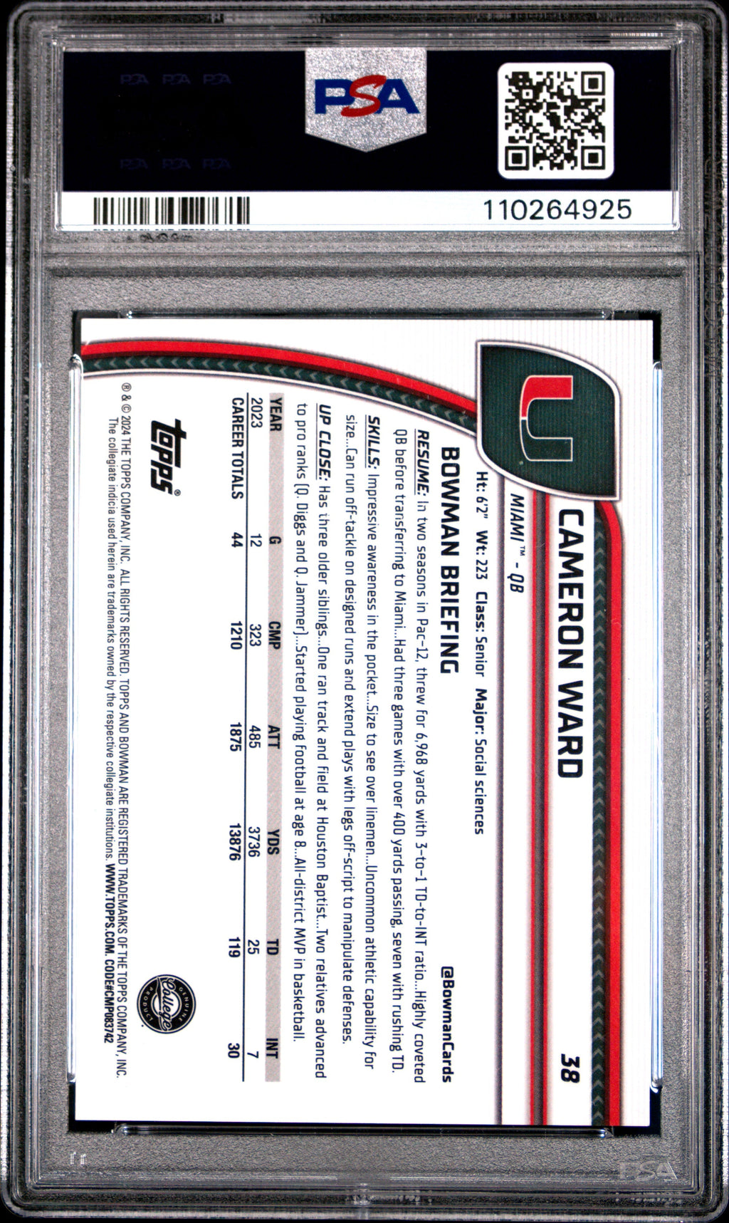 2024 Bowman University Chrome Cameron Ward Fuchsia Refractor #38 PSA 9 Don’t miss your chance to own this 2024 Bowman University Chrome Cameron Ward Fuchsia Refractor, graded PSA 9! This highly sought-after football card features the rising star Cameron Ward and is a must-have for collectors looking to add a rare and vibrant parallel to their collection. With only 5 graded at this level and just 1 graded higher, this card stands out for its scarcity and eye-catching design. Professionally authenticated by PSA with certification number 110264925, this card combines Bowman’s trusted quality with a stunning fuchsia refractor finish. Secure this limited gem today and showcase a standout piece from the 2024 Bowman University Chrome set in your collection! Graded: Yes Sport: Football Population Higher: 1 Set: 2024 Bowman University Chrome Parallel/Variety: Fuchsia Refractor Certification Number: 110264925 Grader: Professional Sports Authenticator (PSA) Manufacturer: Bowman Population: 5 Year Manufactured: 2024 Grade: 9 Player/Athlete: Cameron Ward Card Number: 38 Listed With Mascot.