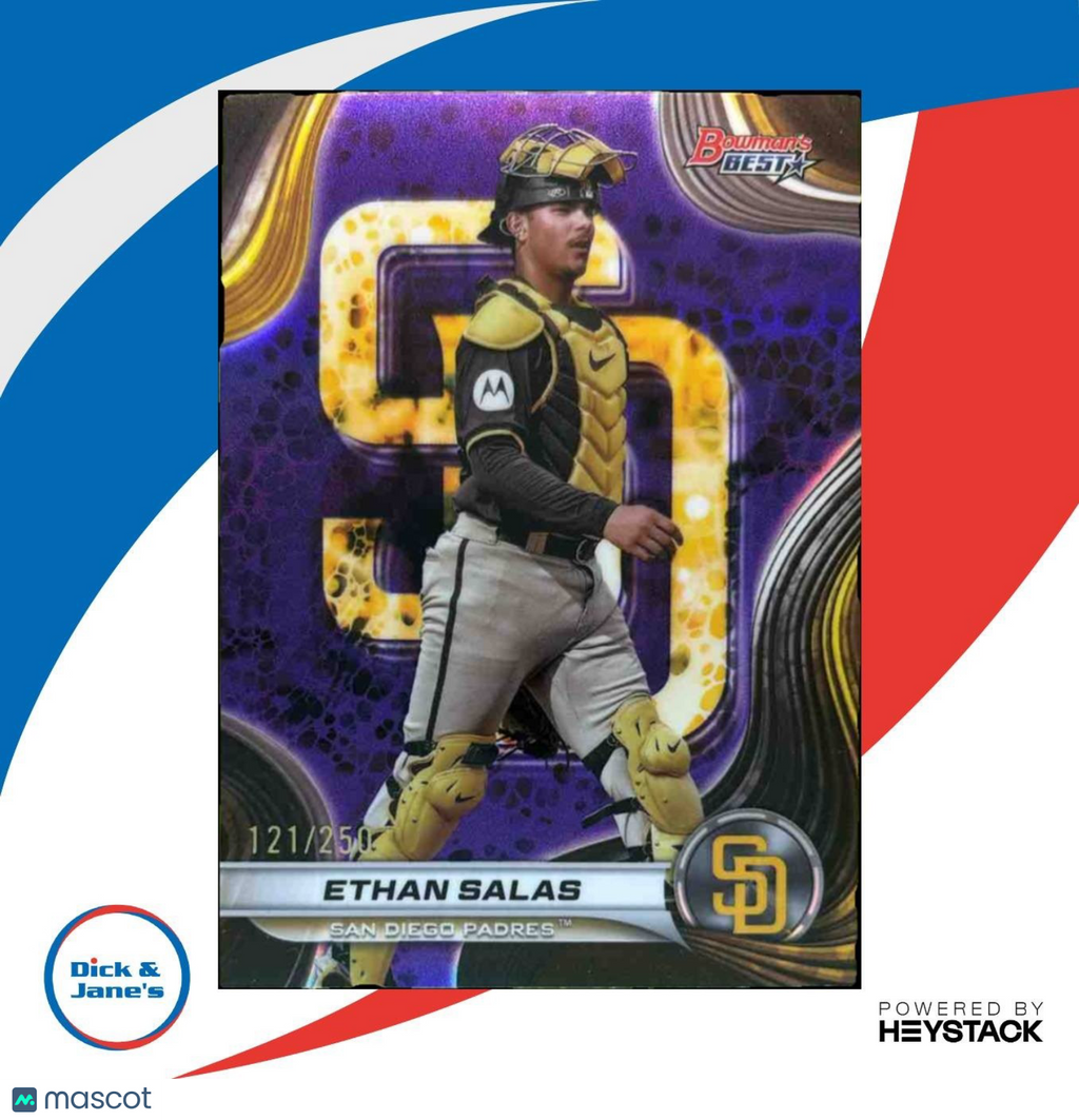 2024 Bowman's Best Ethan Salas Prospects Purple /250 #TP-19 San Diego Padres trading card is a limited edition collectible showcasing the young talent of Salas. This MLB card features vibrant purples and is numbered out of only 250. A must-have for any baseball card enthusiast or San Diego Padres fan. Listed With Mascot.