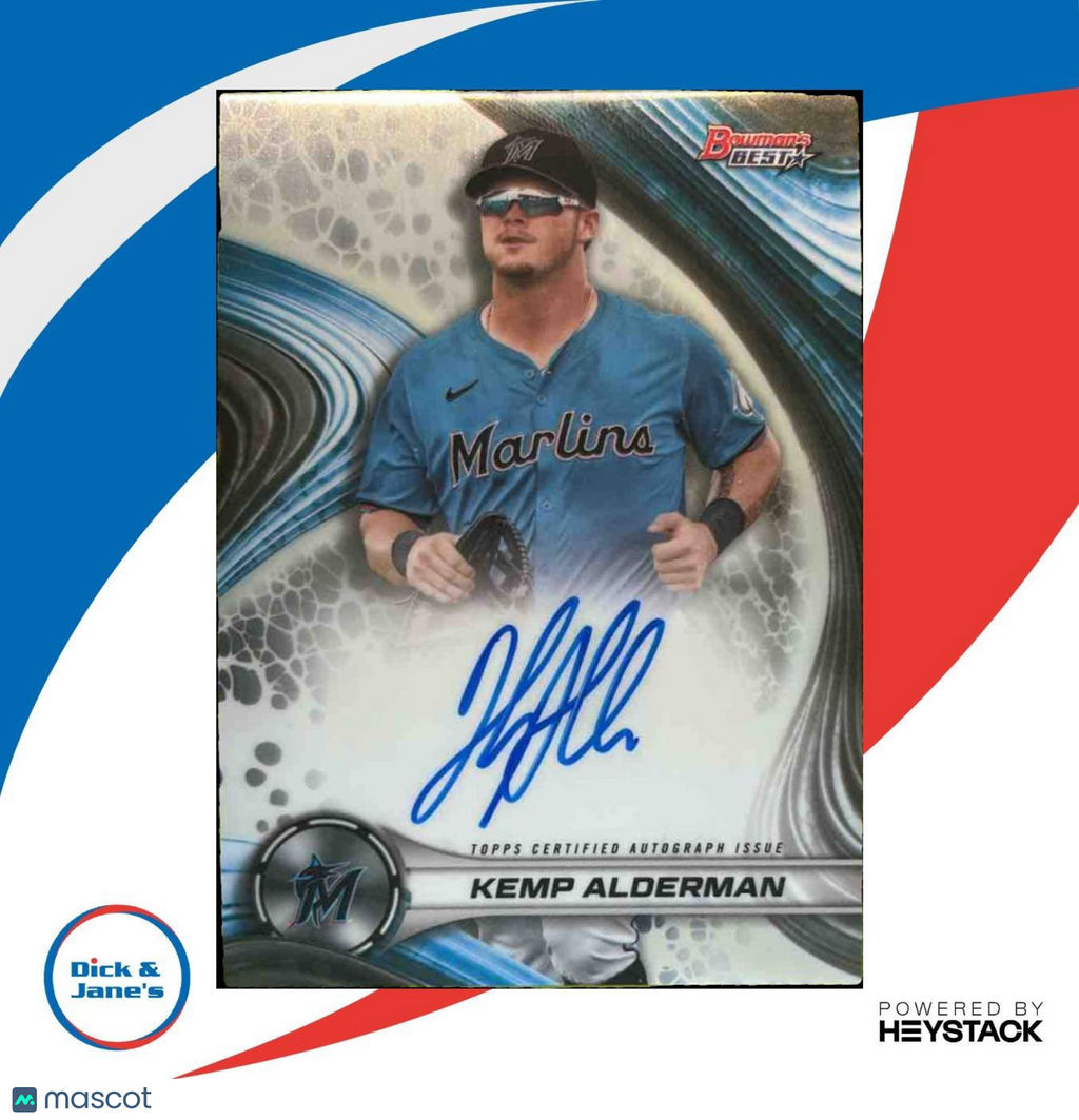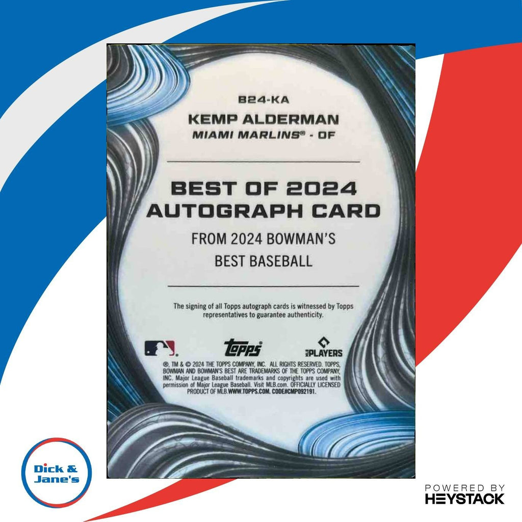 This rare and highly collectible 2024 Bowman's Best Kemp Alderman Best of Auto #B24-KA trading card features an autograph from Miami Marlins player Kemp Alderman. A must-have for any baseball card collector, this MLB card is a valuable addition to your collection. Don't miss out on your chance to own this limited edition card! Listed With Mascot.