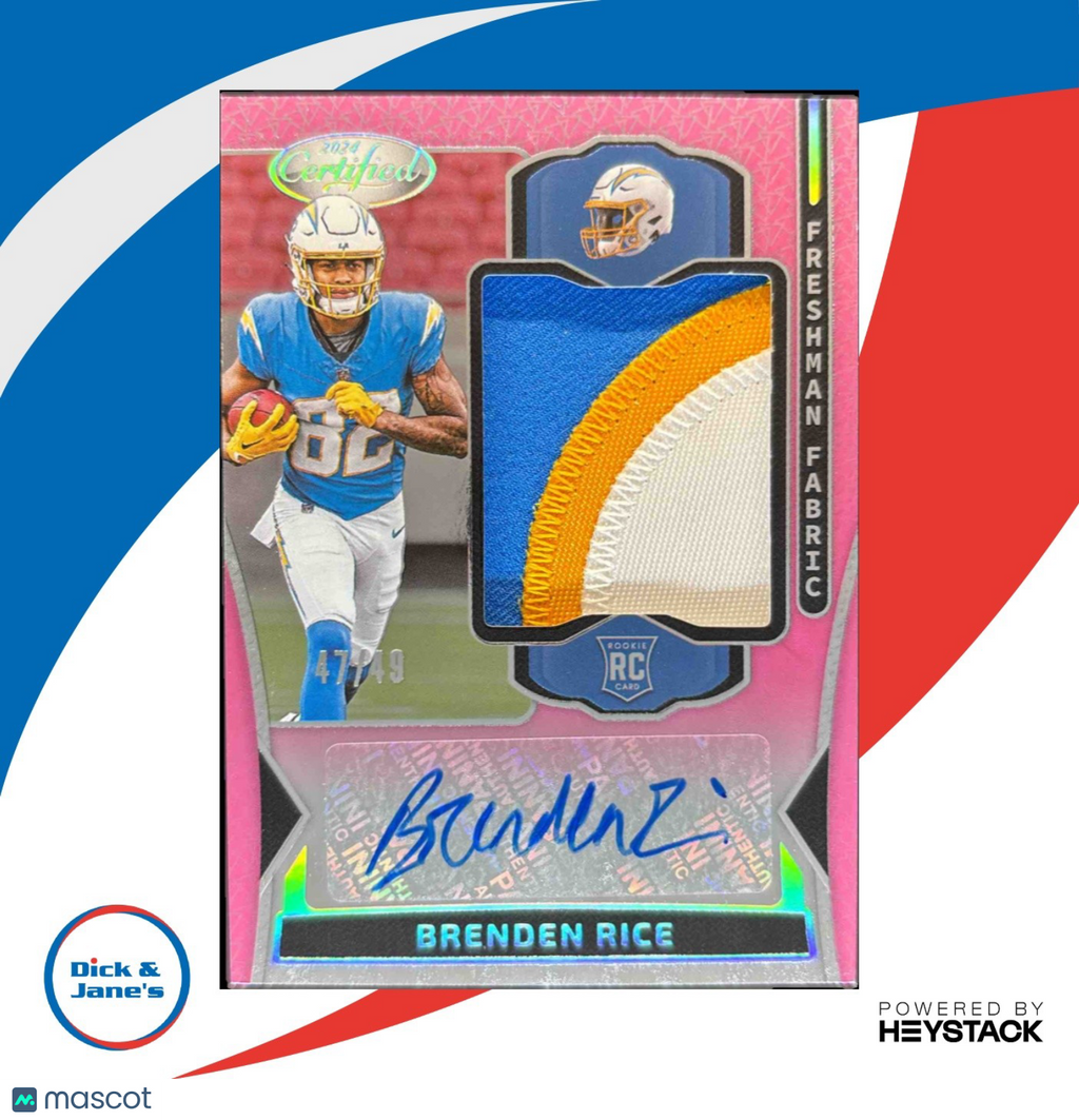 Powered by Frooition Home About Us Contact Other Baseball Baseball Rookies Baseball Inserts Baseball Game Used/Relics Baseball Autographed Football Football Rookies Football Inserts Football Game Used/Relics Football Autographed Basketball Basketball Rookies Basketball Inserts Basketball Game Used/Relics Basketball Autographed Hockey NASCAR Hard Cover Books Music CDs Baseball Boxes Baseball Pack Lots Football Boxes Football Pack Lots Other Boxes Othe Pack Lots Magic Singles 2024 Certified Brenden Rice Freshman Fabric Mirror Signatures Pink Etch 47/49 RC 2024 Certified Brenden Rice Freshman Fabric Mirror Signatures Pink Etch 47/49 RC Item Description Grab the 2024 Certified Brenden Rice Freshman Fabric Mirror Signatures Pink Etch 47/49 RC trading card now! This NFL card features a rare MEM RC Auto, making it a must-have for any collector. Don't miss out on this limited edition item. Order yours today! About Us About Us PSA Grading Consignments Buying Cards EBay Live About Us Yes, there was a Dick & Jane! Originally founded in 1989, Dick & Jane's is Jacksonville's oldest hobby and collectibles store. Our focus is on the collector. We started small with comics, coins and cards and evolved based upon our customers needs and desired and now have 14 employees and over 5 million sportscards and nearly 700,000 different items on our dedicated singles sportscard website We have thousands of raw TCG cards in store. Magic the Gathering and Pokemon! We have Jacksonville s largest selection of graded sports and non-sports cards, all accessible on our website! We engage with our customers! Let us know what you would like to see in the store or changes you would suggest that we make. We would like to start hosting MONTHLY TRADE NIGHTS! We always are buying and trading! WE ARE THE LOCAL HOBBY STORE!!! Stop by if you are in the Jacksonville Area! We are right off I-95 near downtown. PSA Grading PSA Grading We