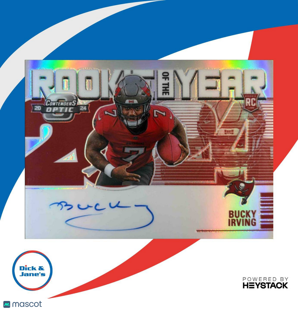 2024 Contenders Optic Bucky Irving Rookie of the Year /99 Auto Buccaneers Listed With Mascot.
