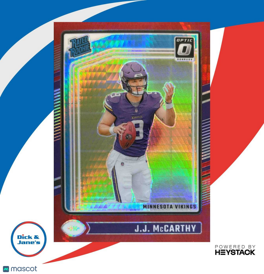 2024 Donruss Optic J.J. McCarthy Red Hyper #235 Rated Rookie card featuring the talented quarterback prospect from the Minnesota Vikings. Perfect for collectors looking to add a promising young player to their collection. Don't miss your chance to own this highly sought-after NFL trading card. Listed With Mascot.