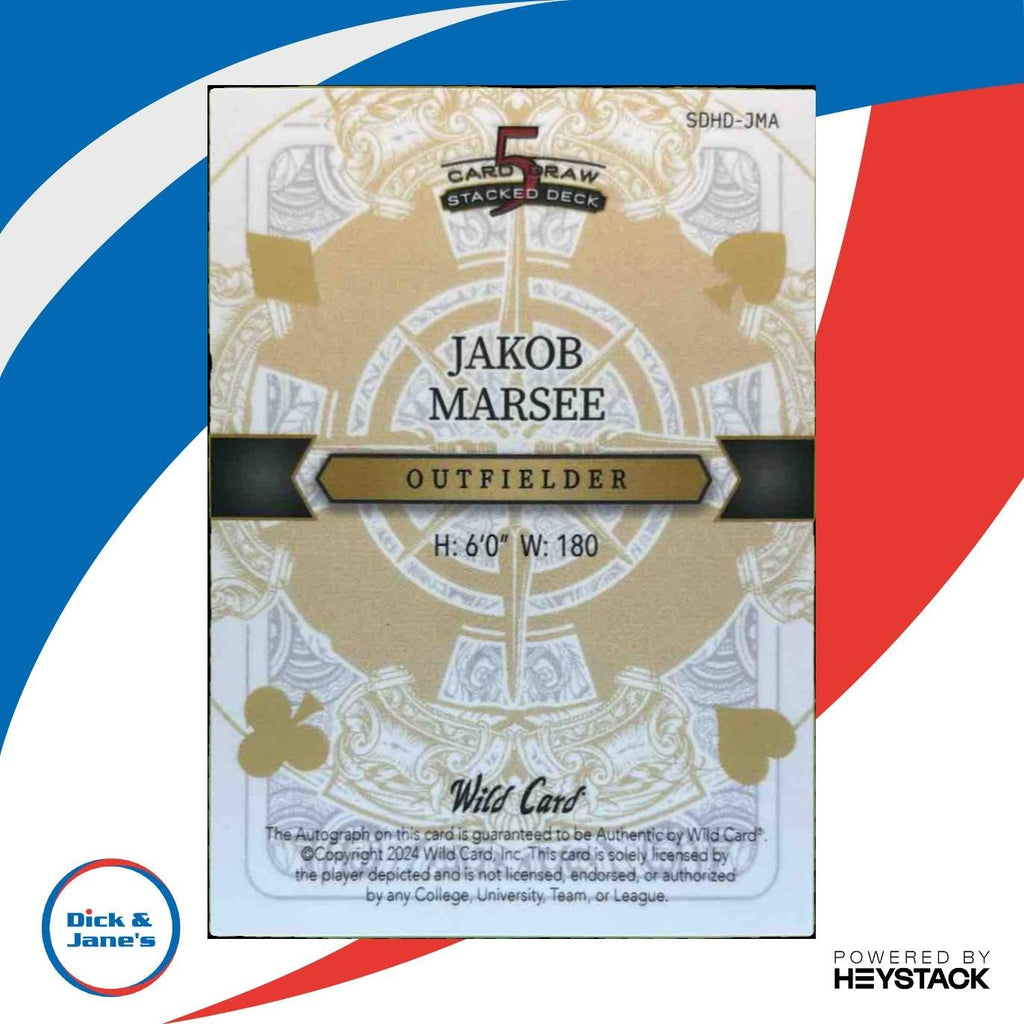 Add the stunning and rare 2024 Five Card Stacked Deck 1/1 Auto Jakob Marsee Queen of Diamonds MLB trading card to your collection! This 1st Prospect Auto card features a unique design and is sure to be a standout piece. Don't miss your chance to own this one-of-a-kind collectible. Listed With Mascot.