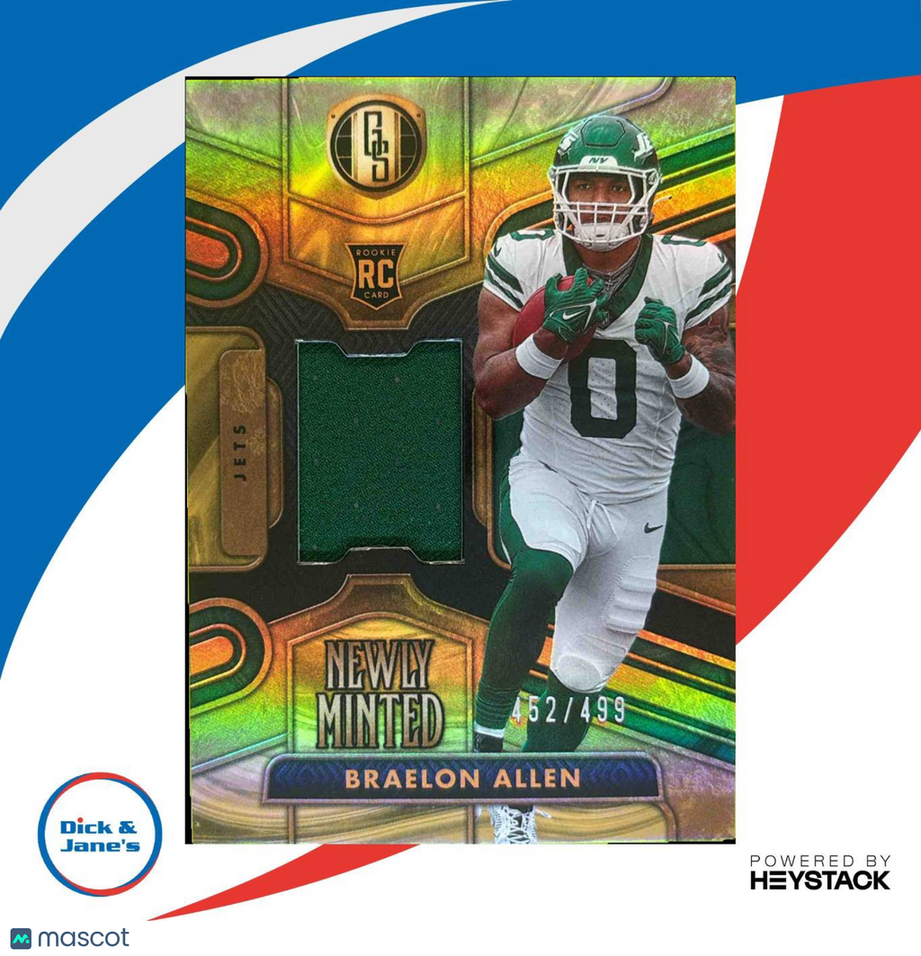 The 2024 Gold Standard Braelon Allen trading card is a rare and highly sought-after collectible for any New York Jets fan. This MEM RC card features a limited edition print of 452 out of 499, making it a special addition to any collection. Own a piece of history with this exclusive NFL card showcasing the talented rookie Braelon Allen. Hurry, before it's gone! Listed With Mascot.