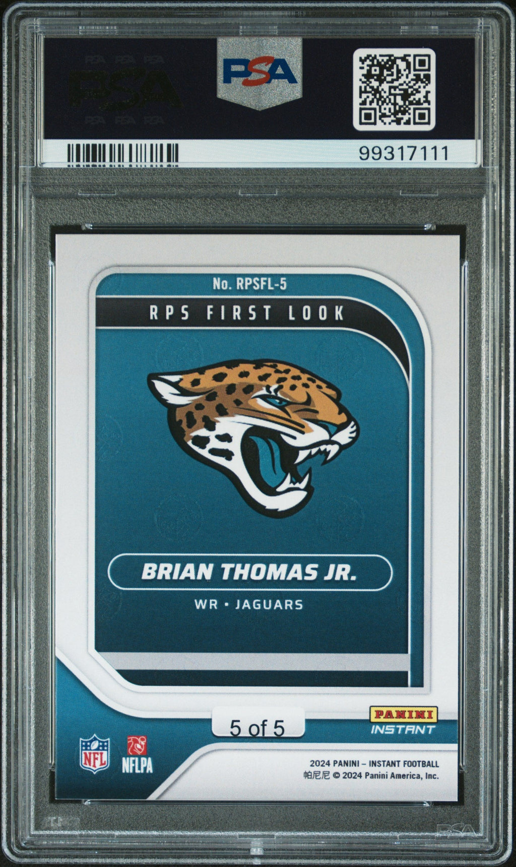 2024 Panini Instant NFL RPS First Look Brian Thomas JR. White Tiger Rookie #RPSFL5 PSA 9 MINT Jacksonville Jaguars Don't miss your chance to add this rare 2024 Panini Instant NFL RPS First Look Brian Thomas JR. White Tiger Rookie card to your collection! Professionally graded PSA 9, this card is one of only 2 in existence with just 1 graded higher, making it a true standout for collectors and Jacksonville Jaguars fans alike. Featuring the highly sought-after White Tiger parallel and official rookie status, this card is a must-have for anyone looking to invest in the future of football talent. With its pristine PSA authentication and unique serial number 99317111, this card offers both authenticity and exceptional display appeal. Whether you're a dedicated Brian Thomas JR. supporter or building a premium rookie card lineup, this limited-population gem is ready to elevate your collection. Act fast—opportunities like this don't come around often! Set: 2024 Panini Instant NFL RPS First Look Certification Number: 99317111 Grader: Professional Sports Authenticator (PSA) Year Manufactured: 2024 Grade: 9 Player/Athlete: Brian Thomas JR. Graded: Yes Sport: Football Population Higher: 1 Parallel/Variety: White Tiger Manufacturer: Panini Population: 2 Team: Jacksonville Jaguars Features: Rookie Card Number: RPSFL5 Listed With Mascot.
