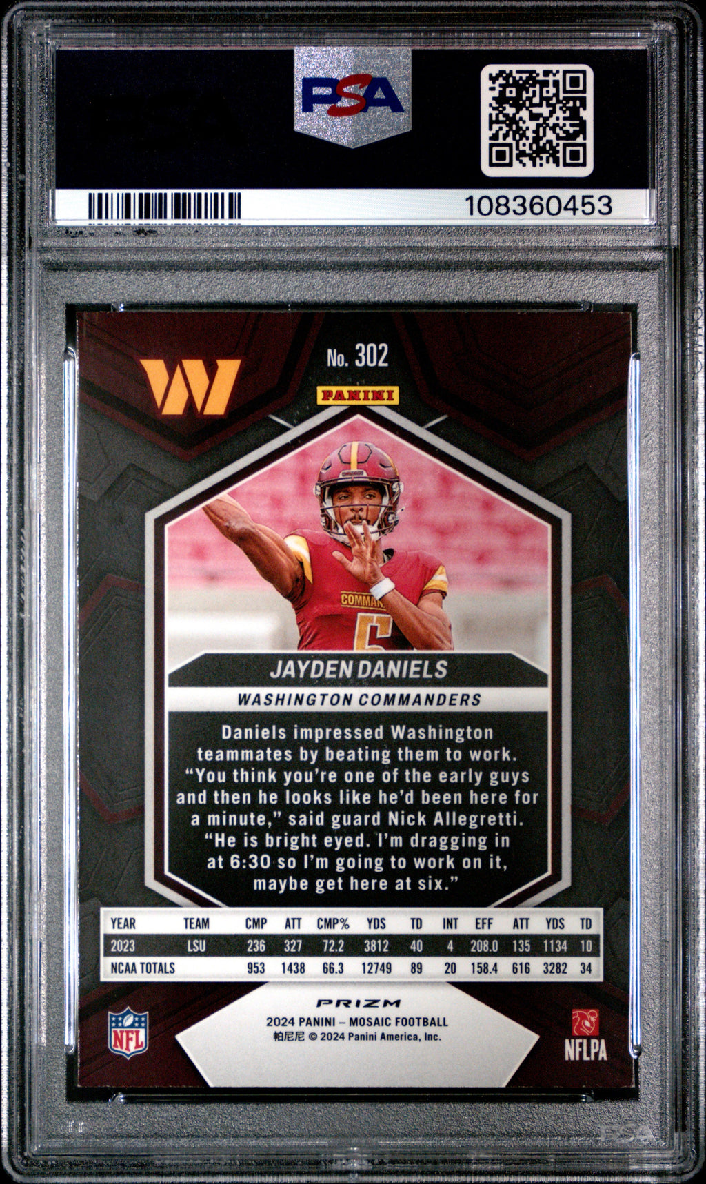 You are purchasing the following: 2024 Panini Mosaic Jayden Daniels Camo Red Rookie #302 PSA 9 Washington Commanders. You will receive the exact item in the photographs. Note: Please do not connact us and asking the following: 1. What is the lowest you would take? Just make an offer. If the offer is automatically declined, you have your answer. 2. What the best you can do? See above. Not repling to an email is a reply. 3. Any room on this? See above. Not repling to an offer is a reply. 4. We ONLY do one counter offer, so please make your best offer the first time! Note: If the price off, in your option, please send your resaoning and an offer. We will review it. Note: We manage nearly 10 millon cards regularly and will adjust prices as errors are noticed or pointed out! Listed With Mascot.