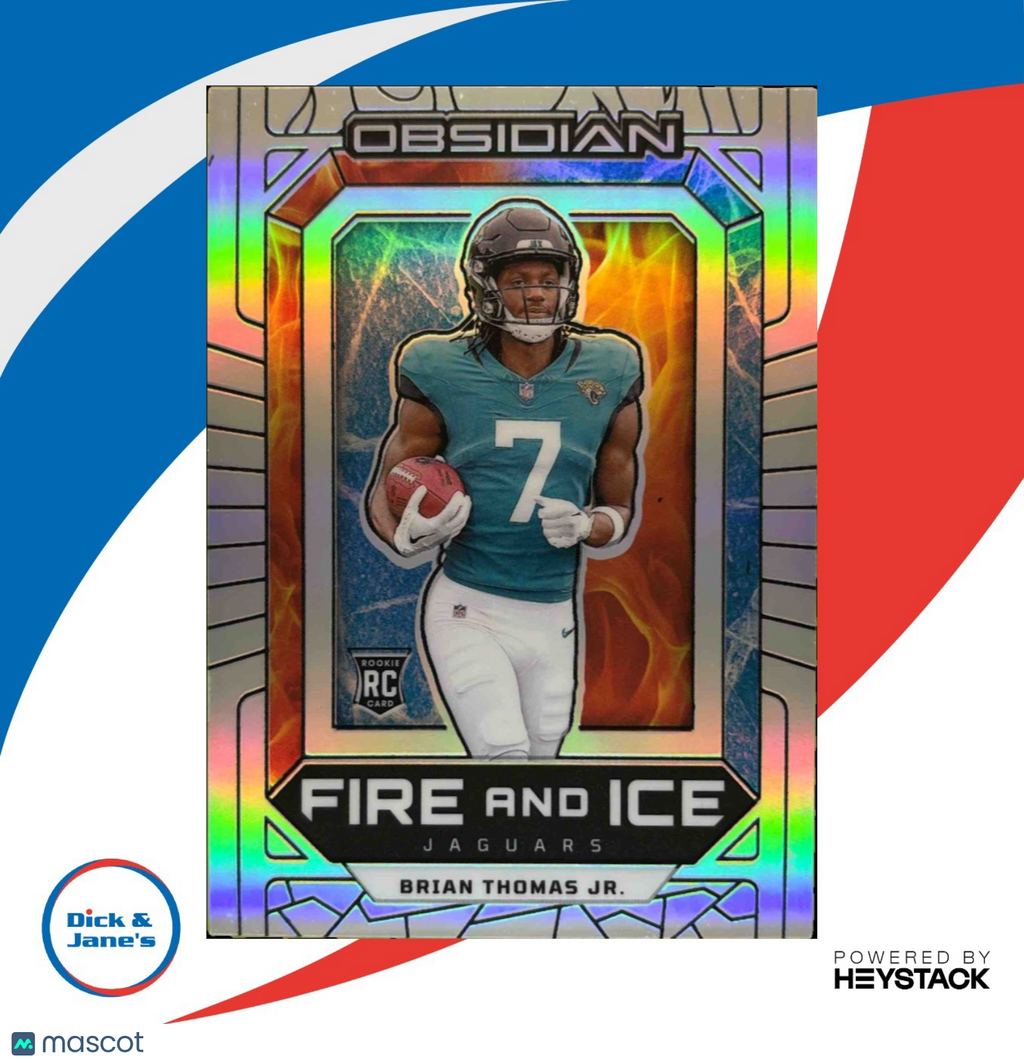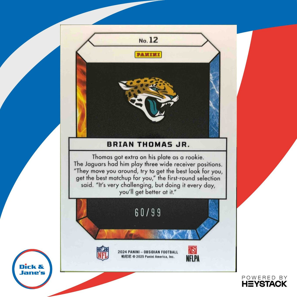 Rare 2024 Obsidian Brian Thomas Fire and Ice Silver 60/99 #12 RC trading card featuring the Jacksonville Jaguars rookie. A must-have for any football card collector. Limited edition card with stunning design - a true gem for any enthusiast. Get yours now! Listed With Mascot.