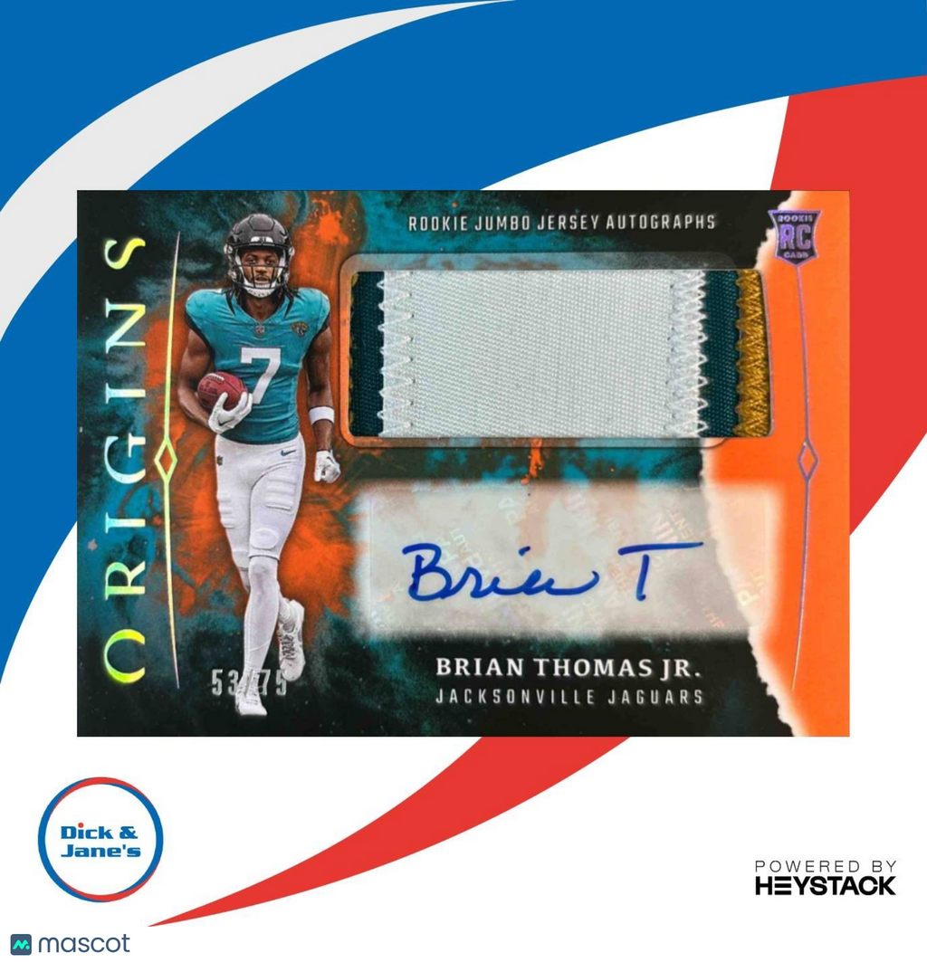 Own a piece of sports history with this 2024 Origins Brian Thomas Jr. Rookie Jumbo Jersey Auto Orange Patch trading card. Limited to only 75 copies, this NFL card features an authentic autograph and game-worn jersey patch. Perfect for collectors and fans alike, grab this rare card to add to your collection or gift to a fellow Jaguars enthusiast. Don't miss out on this RC Auto card! Listed With Mascot.