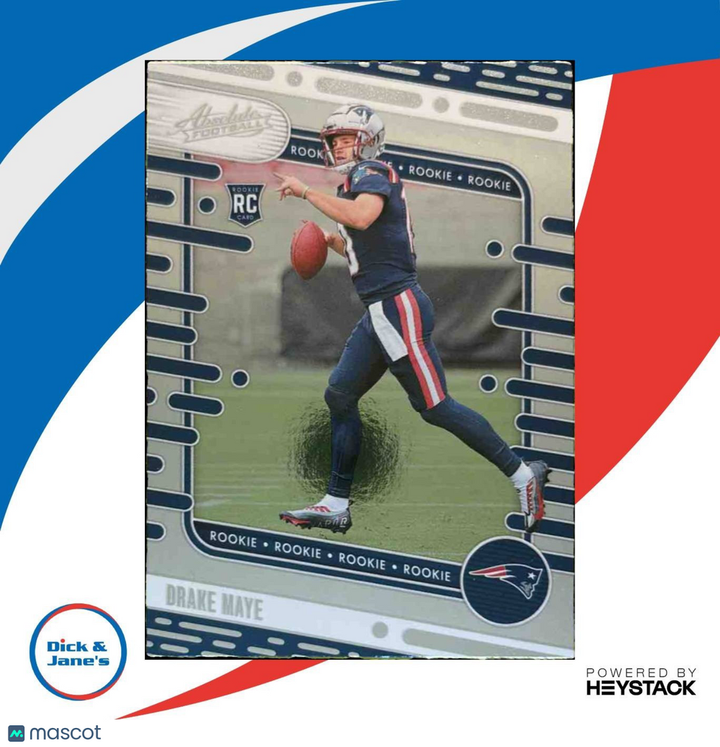 : Get your hands on the highly sought-after 2024 Panini Absolute Drake Maye Rookies #103 RC card featuring the New England Patriots quarterback. This NFL rookie card is a must-have for any collector, showcasing Maye's potential as a rising star in the league. Don't miss out on this rare and valuable addition to your collection! Listed With Mascot.