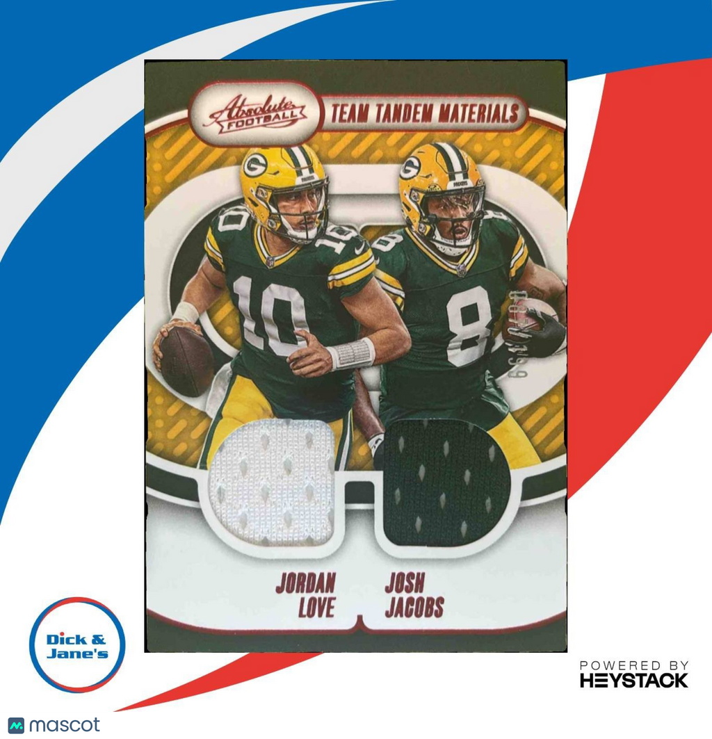 Own a piece of football history with this rare 2024 Panini Absolute Team Tandem Patch trading card featuring Jordan Love and Josh Jacobs of the Packers. Limited to only 199 copies, this card showcases authentic player-worn patches for true fans and collectors. Listed With Mascot.