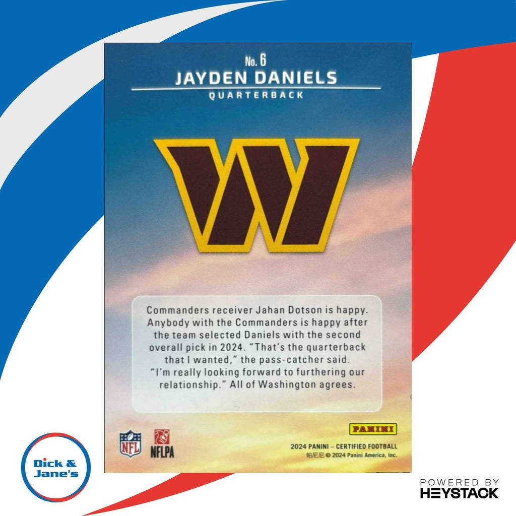 2024 Panini Certified Jayden Daniels Franchise Foundations #6 RC Commanders sports trading card featuring a promising NFL rookie. This rare card is a must-have for collectors and fans alike. Don't miss out on adding this highly sought after item to your collection! Listed With Mascot.