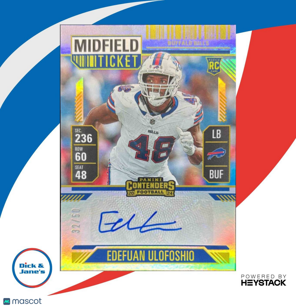 The 2024 Panini Contenders Edefuan Ulofoshio Rookie Auto Midfield card is a rare find for any Bills fan or NFL collector. This card features Ulofoshio's rookie signature and is numbered out of only 50. Don't miss your chance to own this unique piece of football memorabilia. Listed With Mascot.