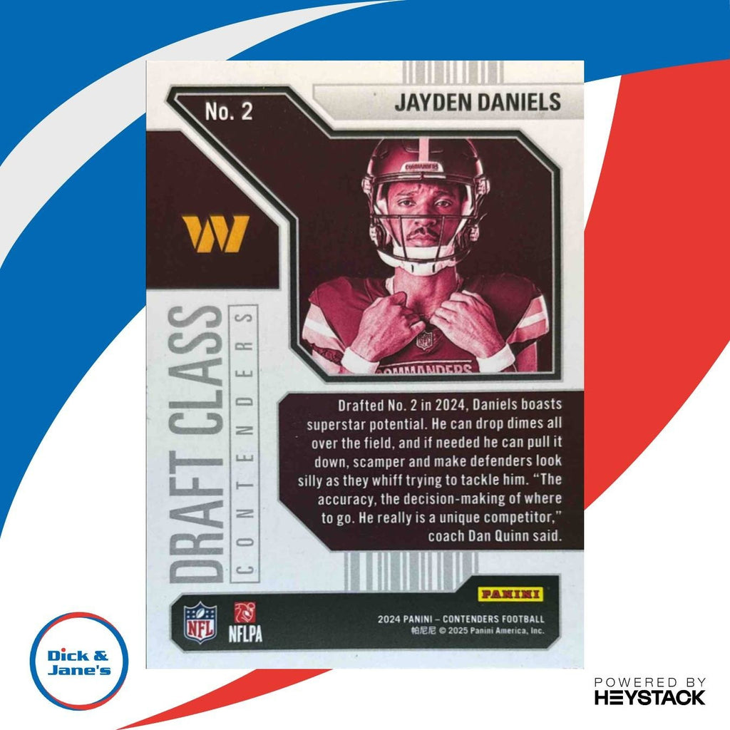Own a piece of NFL history with this rare 2024 Panini Contenders Jayden Daniels Draft Class trading card. Limited edition teal RC card numbered 87/149, featuring the rising star as a member of the Commanders. A must-have for any football card collector! Listed With Mascot.