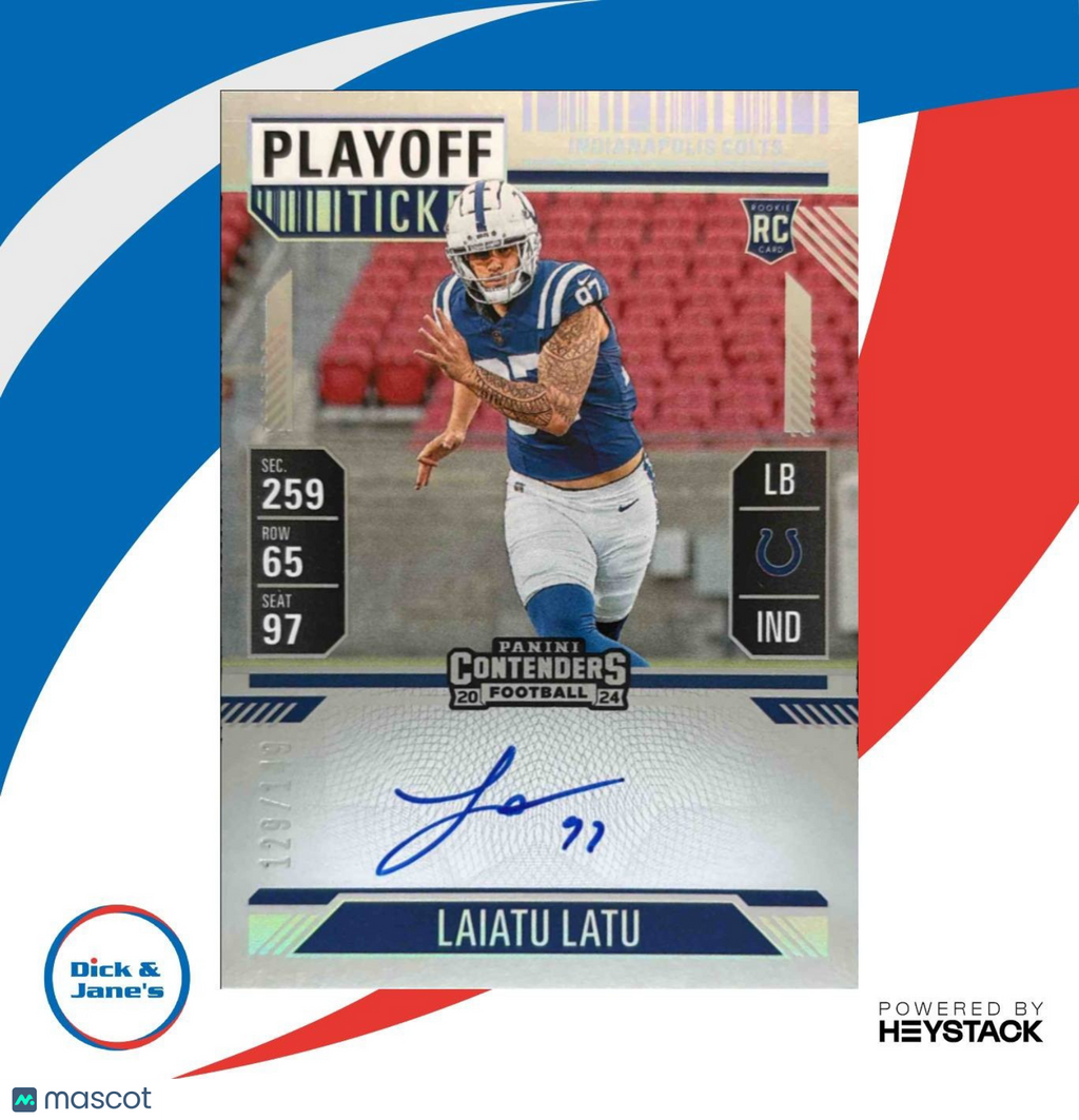 This 2024 Panini Contenders Laiatu Latu Rookie Ticket Auto Playoff #129 card is a must-have for any NFL collector. Limited to only 149 copies, this rare autographed card features the up-and-coming Colts player in his rookie season. Don't miss your chance to own a piece of football history! Listed With Mascot.