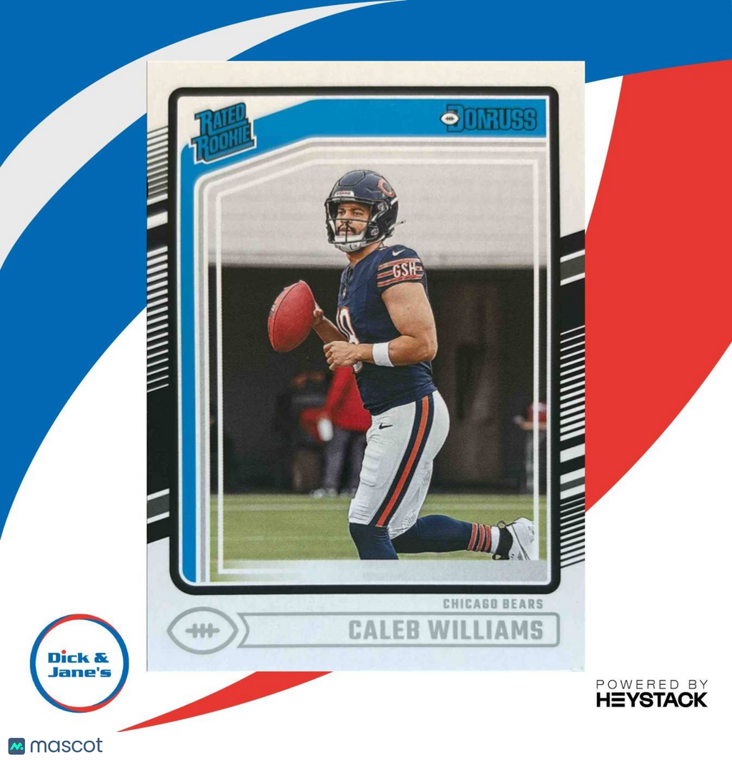 This 2024 Panini Donruss Caleb Williams #327 RC Rated Rookie Chicago Bears sports trading card is a must-have for any NFL collector. With a fresh rookie design, this card captures the rising star in his early career. Don't miss your chance to own a piece of future football history! Listed With Mascot.