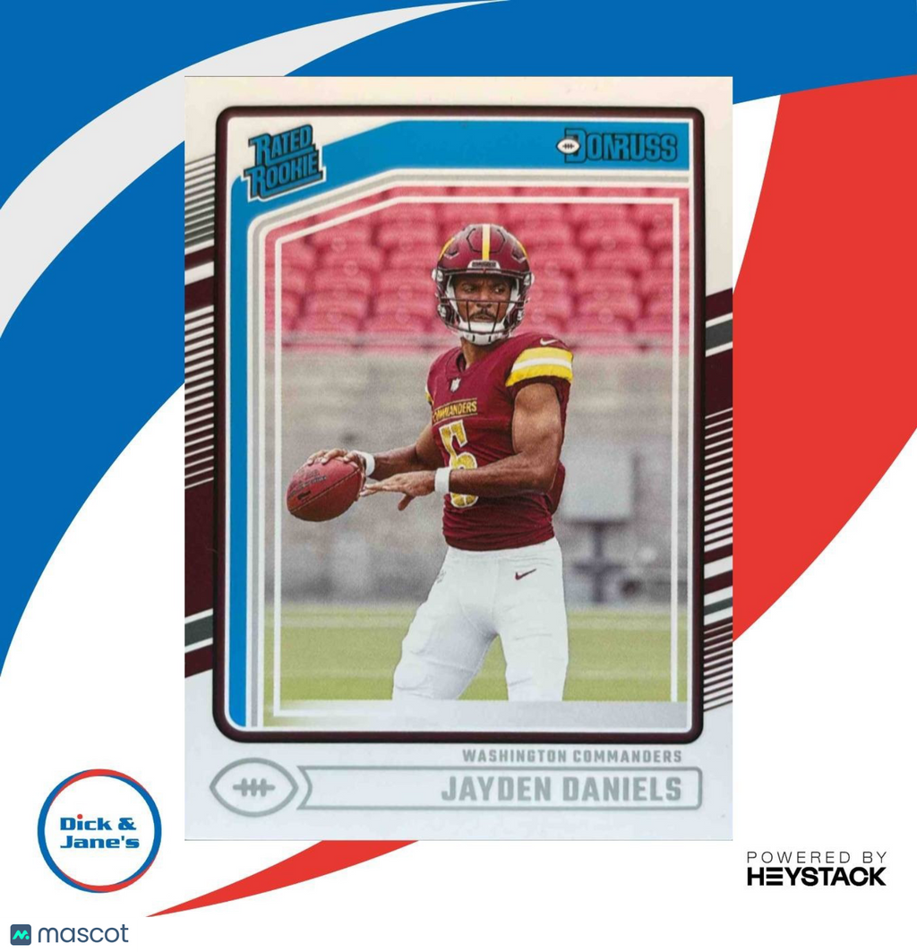 Get your hands on the highly sought-after 2024 Panini Donruss Jayden Daniels #389 RC Rated Rookie trading card featuring the rising star from the Washington Commanders. Perfect for NFL collectors, this card is a must-have for any fan looking to add to their collection. Don't miss out on this rare gem! Listed With Mascot.