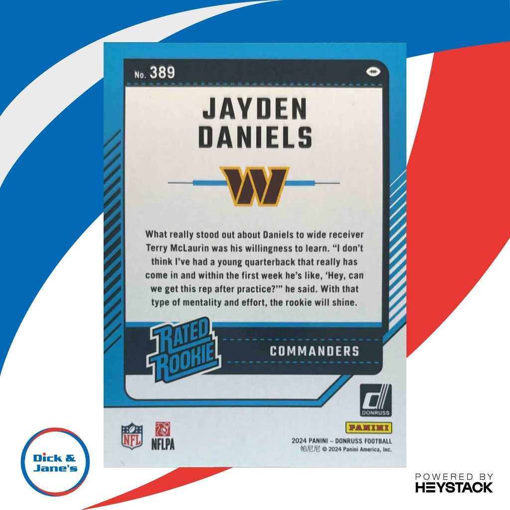 Looking to add a rare collectible to your sports trading card collection? Check out the 2024 Panini Donruss Jayden Daniels Press Proof Purple #389 Washington Commanders NFL card. This Rated Rookie card showcases the talented player and is sure to be a valuable addition to any collection. Get it now before it's gone! Listed With Mascot.