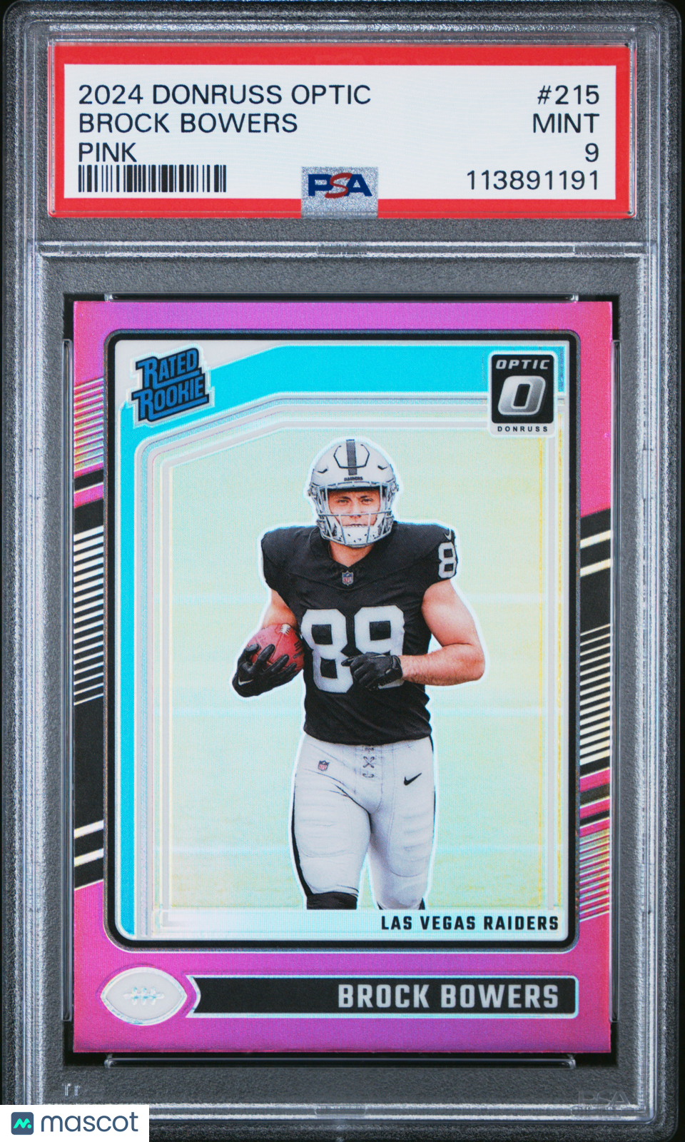 You are purchasing the following: 2024 Panini Donruss Optic Brock Bowers Pink Rookie #215 PSA 9 Las Vegas Raiders. You will receive the exact item in the photographs. Note: Please do not connact us and asking the following: 1. What is the lowest you would take? Just make an offer. If the offer is automatically declined, you have your answer. 2. What the best you can do? See above. Not repling to an email is a reply. 3. Any room on this? See above. Not repling to an offer is a reply. 4. We ONLY do one counter offer, so please make your best offer the first time! Note: If the price off, in your option, please send your resaoning and an offer. We will review it. Note: We manage nearly 10 millon cards regularly and will adjust prices as errors are noticed or pointed out! Listed With Mascot.