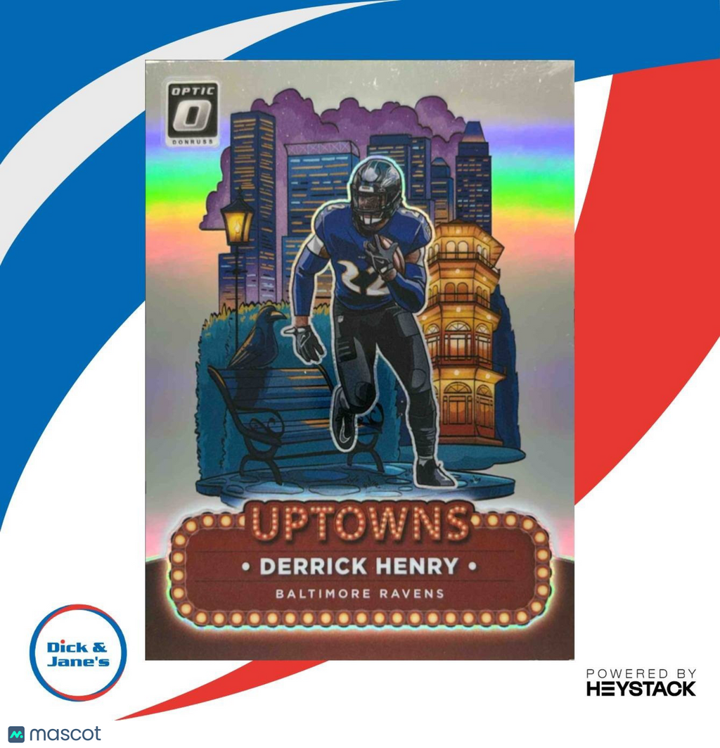 Calling all Baltimore Ravens fans! Don't miss out on adding this rare 2024 Panini Donruss Optic Derrick Henry Uptowns #18 SSP card to your collection. Featuring the star running back, Derrick Henry, this card is sure to be a standout in your collection. Don't wait, grab it now before it's gone! #NFL #Ravens #DerrickHenry #Collectible Listed With Mascot.