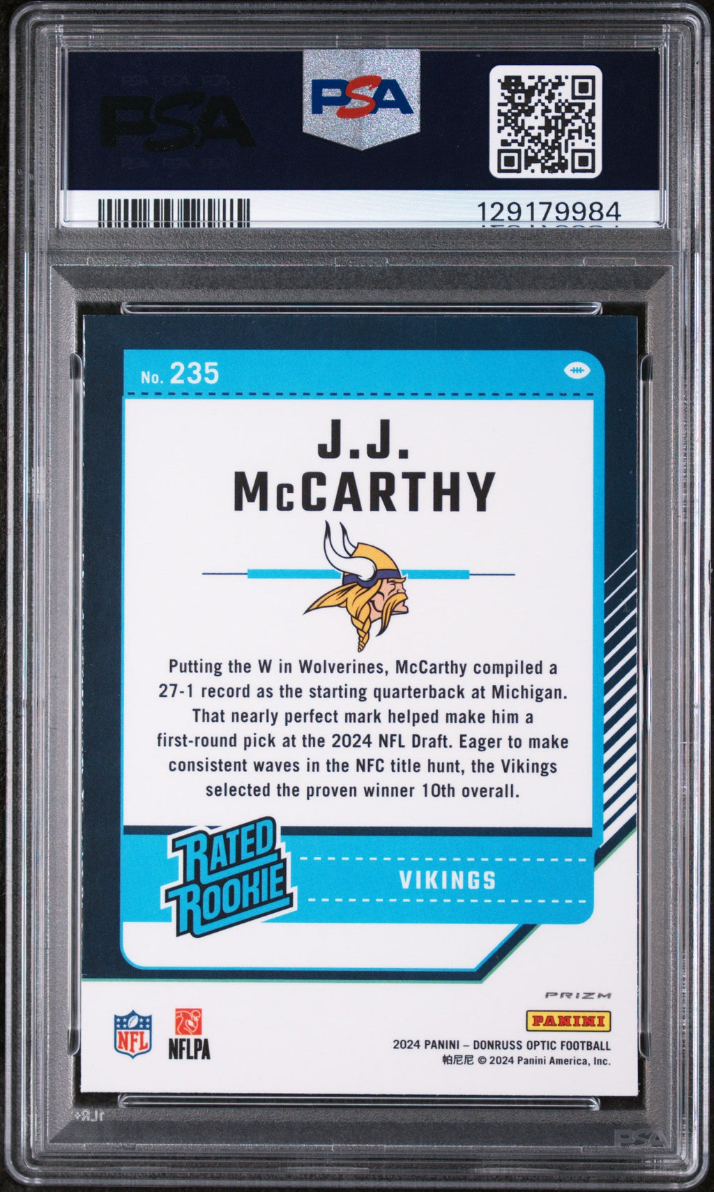2024 Panini Donruss Optic JJ Mccarthy Blue Scope Rated Rookie #235 PSA 9 MINT Don't miss your chance to own this stunning 2024 Panini Donruss Optic JJ Mccarthy Blue Scope Rated Rookie card, professionally graded PSA 9 MINT! This highly sought-after rookie features vibrant Blue Scope parallel shine and is perfect for football collectors and JJ Mccarthy fans looking to add a top-tier card to their collection. With only 94 in the population and just 77 graded higher, this card is a standout investment for any serious hobbyist. Certified authentic by PSA with certification number 129179984, this card showcases the rookie year of one of football's most promising athletes. Secure this rare Blue Scope parallel today and make a valuable addition to your collection before it's gone! Set: 2024 Panini Donruss Optic Certification Number: 129179984 Grader: Professional Sports Authenticator (PSA) Year Manufactured: 2024 Player/Athlete: JJ Mccarthy Grade: 9 Graded: Yes Population Higher: 77 Sport: Football Parallel/Variety: Blue Scope Manufacturer: Panini Population: 94 Features: Rookie Card Number: 235 Listed With Mascot.