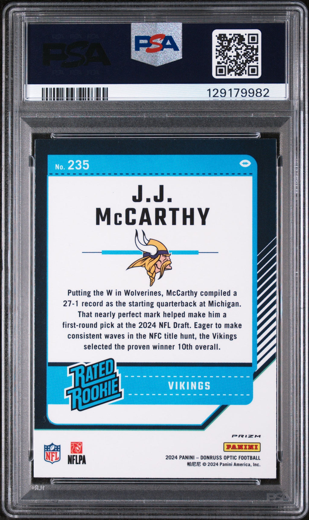 2024 Panini Donruss Optic JJ Mccarthy Holo Rated Rookie #235 PSA 8 Vikings Score a top collectible for your football card collection with this 2024 Panini Donruss Optic JJ Mccarthy Holo Rated Rookie, professionally graded PSA 8! Featuring the highly sought-after Holo parallel and officially marked as a rookie card, this standout piece celebrates one of the most exciting young talents in the game. With only 248 graded examples and just 667 at a higher grade, this card is a must-have for serious collectors and Vikings fans alike. Certified authentic by the Professional Sports Authenticator (PSA) and boasting a unique certification number, this card is ready to display or invest in. Don’t miss your chance to own a rare JJ Mccarthy rookie card from Panini’s popular 2024 Optic set—add it to your collection today! Set: 2024 Panini Donruss Optic Certification Number: 129179982 Grader: Professional Sports Authenticator (PSA) Year Manufactured: 2024 Player/Athlete: JJ Mccarthy Grade: 8 Graded: Yes Sport: Football Population Higher: 667 Parallel/Variety: Holo Manufacturer: Panini Population: 248 Features: Rookie Card Number: 235 Listed With Mascot.