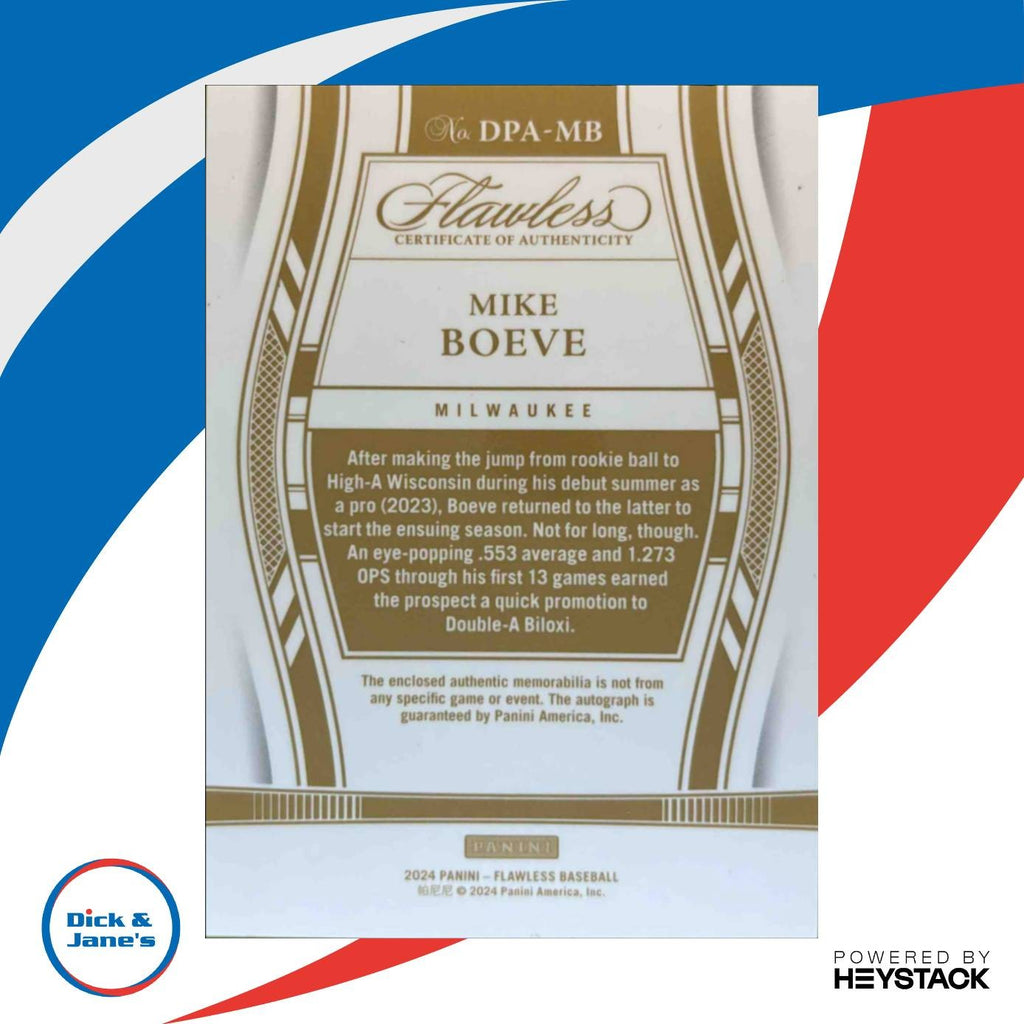 2024 Panini Flawless Mike Boeve Draft Patch Auto Gold 5/10 Milwaukee Brewers Listed With Mascot.