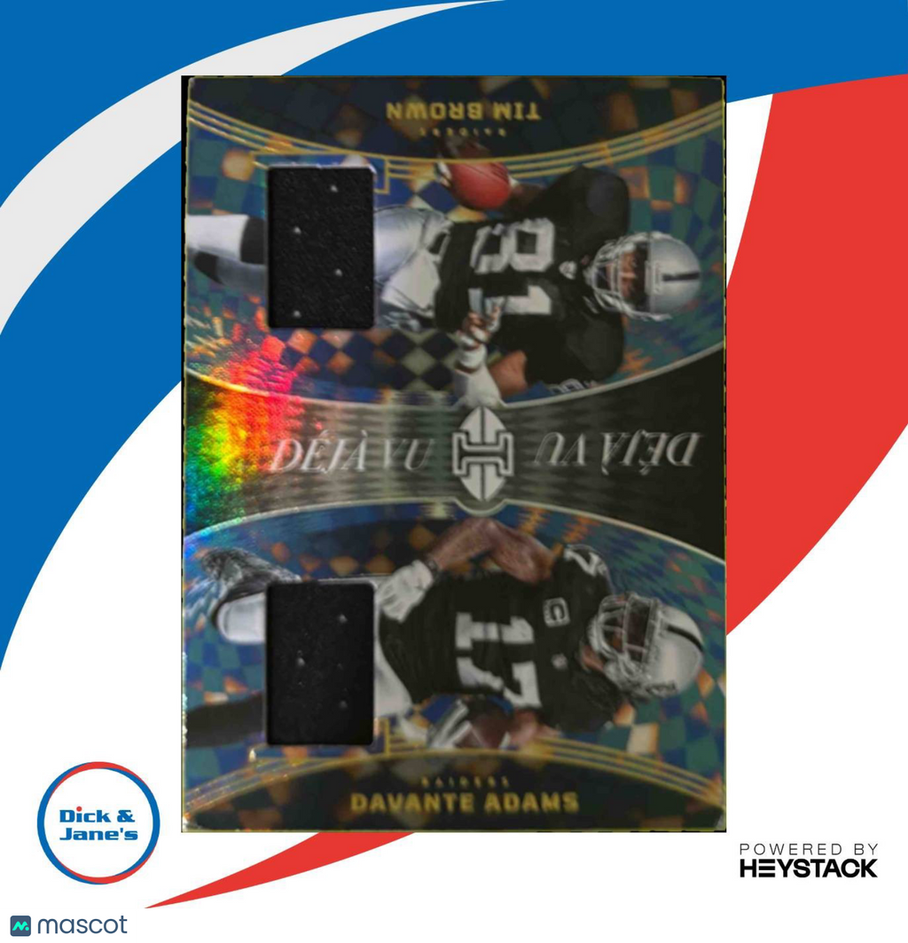 This rare 2024 Panini Illusions trading card features dual jersey swatches of football legends Davante Adams and Tim Brown from the Las Vegas Raiders. A unique Deja Vu design adds intrigue to this limited edition collectible, perfect for any NFL fan's collection. Don't miss your chance to own a piece of football history! Listed With Mascot.