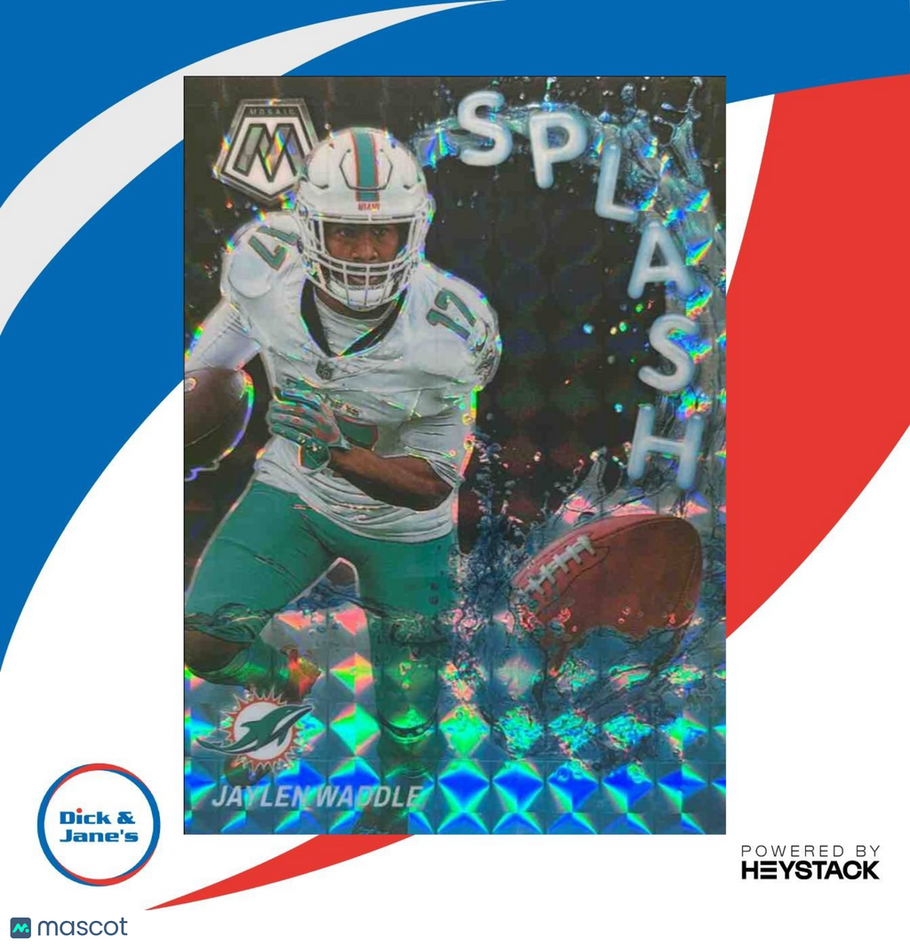 Rare 2024 Panini Mosaic Jaylen Waddle Splash Black 1/1 NFL trading card featuring Miami Dolphins standout. Limited edition TRUE 1/1 card, highly sought after for any collector. Don't miss your chance to own a piece of sports history with this exclusive card. Listed With Mascot.