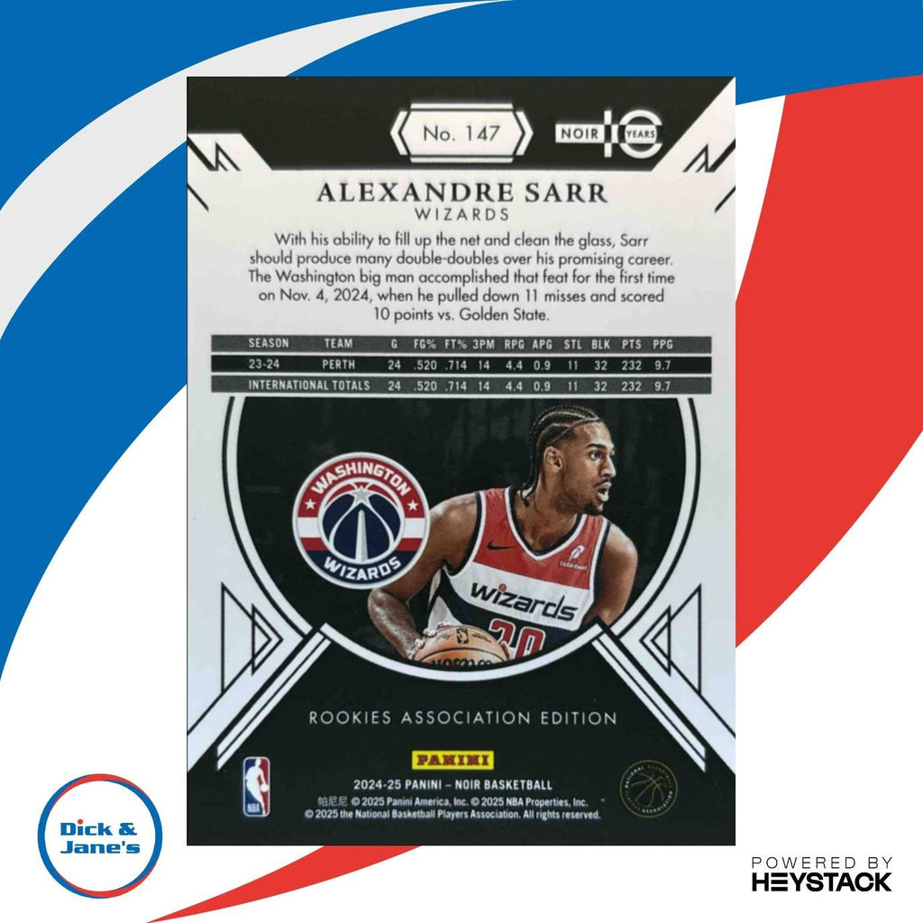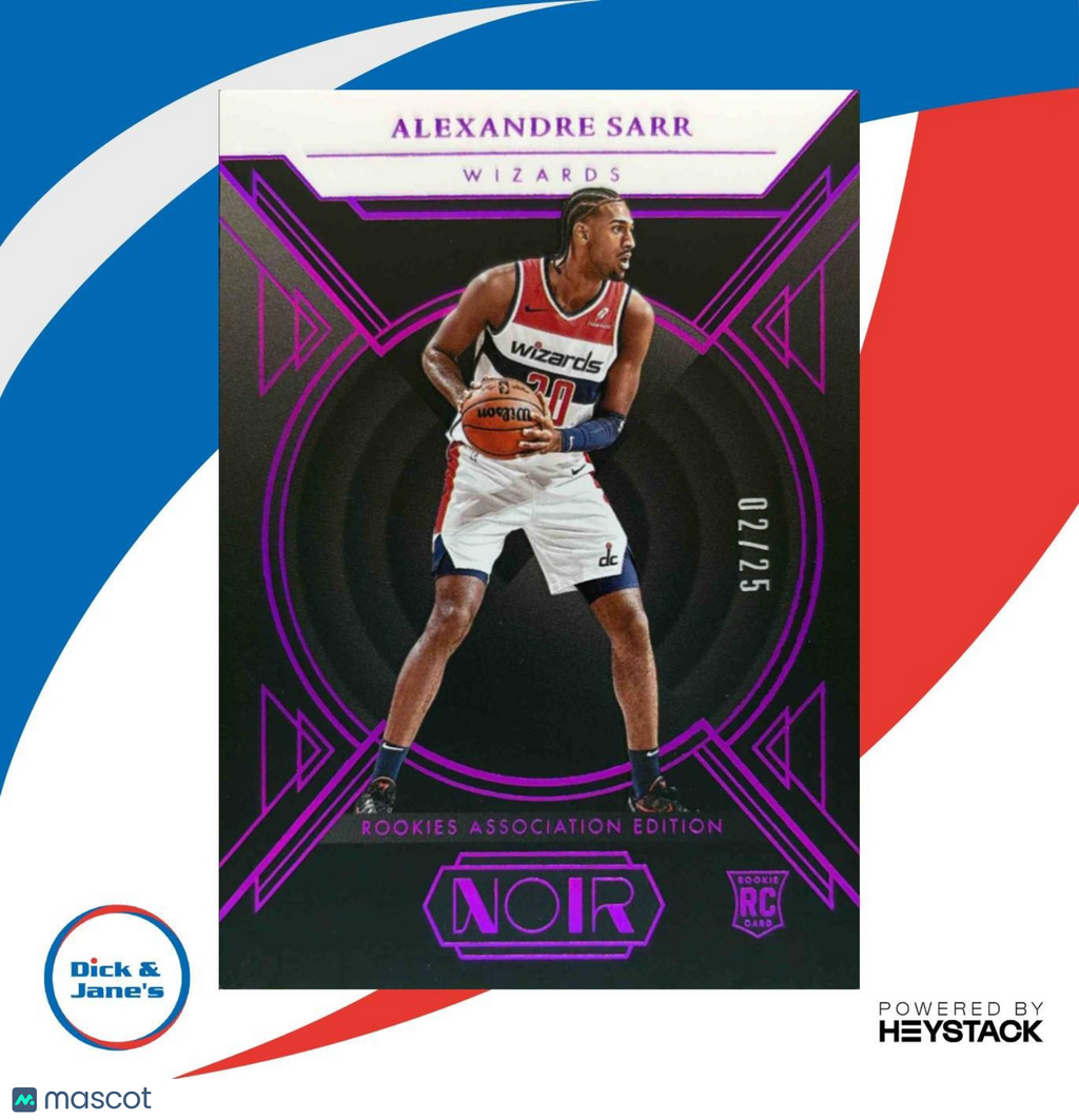 Collect the limited edition 2024 Panini Noir Alexandre Sarr Rookies Association Holo Ruby /25 #147Wizards NBA trading card featuring a young talent from the Washington Wizards. With only 25 in existence, this rare card is a must-have for any basketball card collector. Don't miss out on adding this gem to your collection! Listed With Mascot.