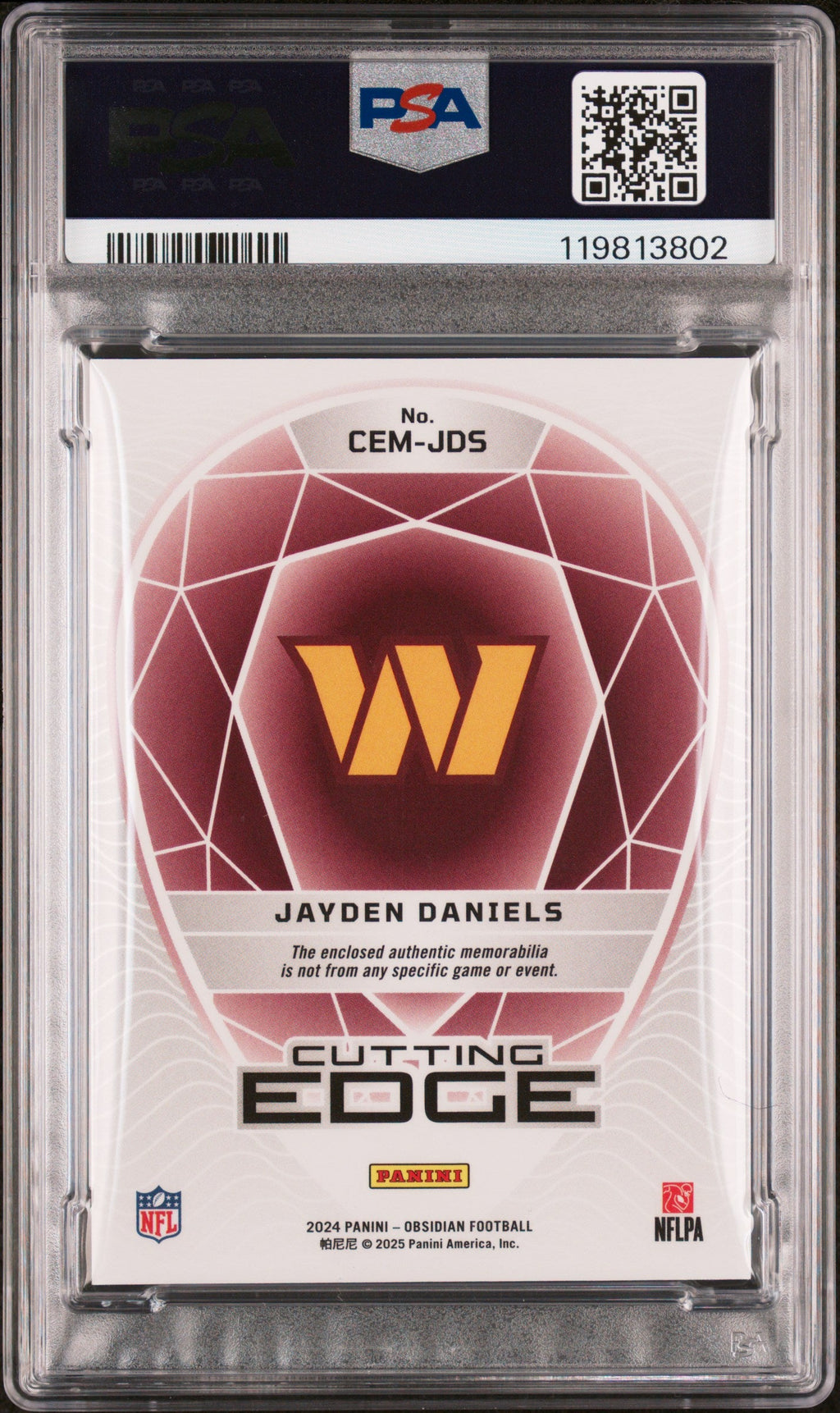 You are purchasing the following: 2024 Panini Obsidian Cutting Edge Materials Jayden Daniels Rookie #CEMJDS PSA 9 . You will receive the exact item in the photographs. Note: Please do not connact us and asking the following: 1. What is the lowest you would take? Just make an offer. If the offer is automatically declined, you have your answer. 2. What the best you can do? See above. Not repling to an email is a reply. 3. Any room on this? See above. Not repling to an offer is a reply. 4. We ONLY do one counter offer, so please make your best offer the first time! Note: If the price off, in your option, please send your resaoning and an offer. We will review it. Note: We manage nearly 10 millon cards regularly and will adjust prices as errors are noticed or pointed out! Listed With Mascot.