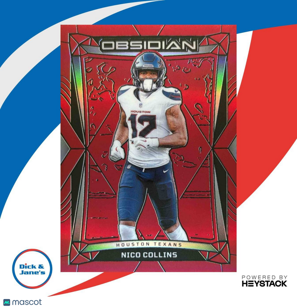 The 2024 Panini Obsidian Nico Collins Red 40/49 #75 Houston Texans trading card is a highly collectible NFL card featuring the talented wide receiver. Limited to only 49 copies worldwide, this card is a rare find for any sports card collector. Don't miss out on adding this unique and valuable piece to your collection! Listed With Mascot.
