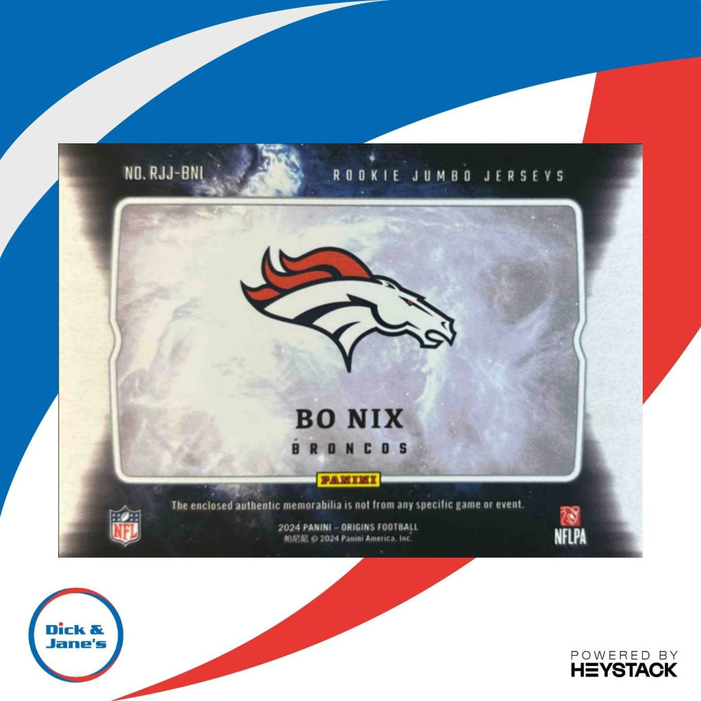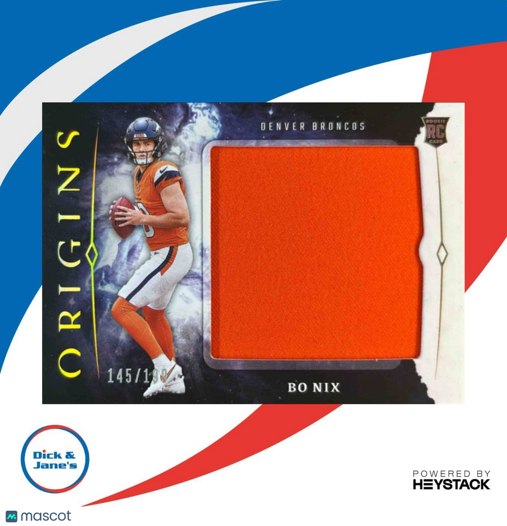 Get your hands on this limited edition 2024 Panini Origins Bo Nix Rookie Jumbo Jerseys trading card featuring a piece of the rookie's jersey. This rare RC card is numbered 145/199 and is a must-have for Denver Broncos fans and NFL collectors alike. Don't miss out on adding this valuable piece to your collection! Listed With Mascot.