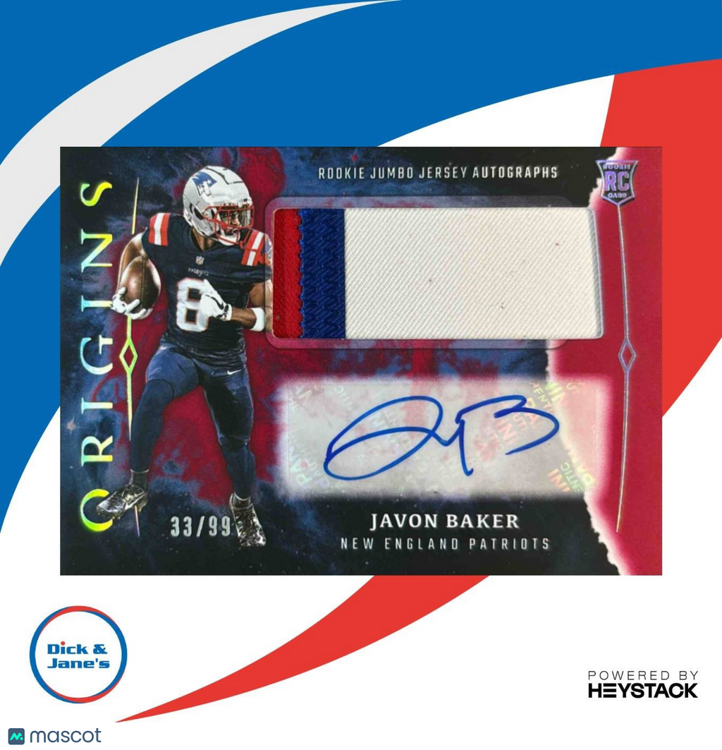The 2024 Panini Origins Javon Baker Rookie Jumbo Jersey Auto Red Patch /99 Patriots card is a must-have for NFL fans and collectors. This limited edition card features a rookie autograph and a game-worn jersey patch, making it a valuable addition to any collection. Don't miss your chance to own this rare and unique sports trading card. Listed With Mascot.