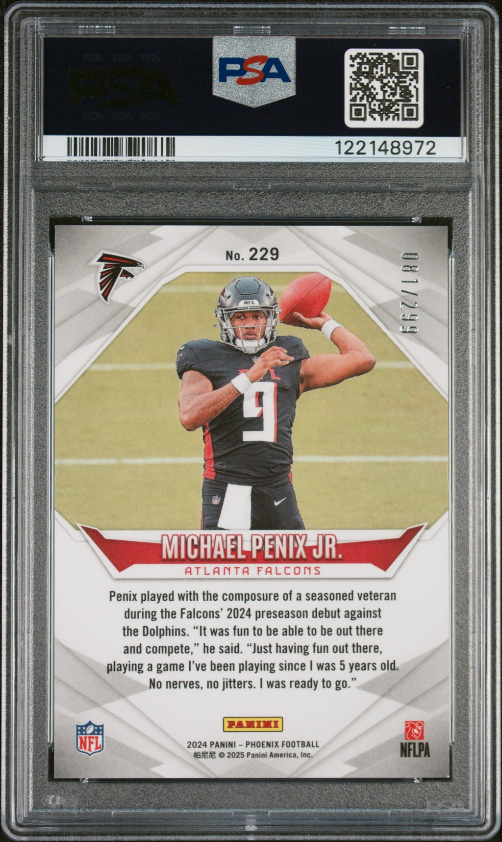 You are purchasing the following: 2024 Panini Phoenix Michael Penix JR. Team Logos Rookie #229 PSA 9 Atlanta Falcons. You will receive the exact item in the photographs. Note: Please do not connact us and asking the following: 1. What is the lowest you would take? Just make an offer. If the offer is automatically declined, you have your answer. 2. What the best you can do? See above. Not repling to an email is a reply. 3. Any room on this? See above. Not repling to an offer is a reply. 4. We ONLY do one counter offer, so please make your best offer the first time! Note: If the price off, in your option, please send your resaoning and an offer. We will review it. Note: We manage nearly 10 millon cards regularly and will adjust prices as errors are noticed or pointed out! Listed With Mascot.