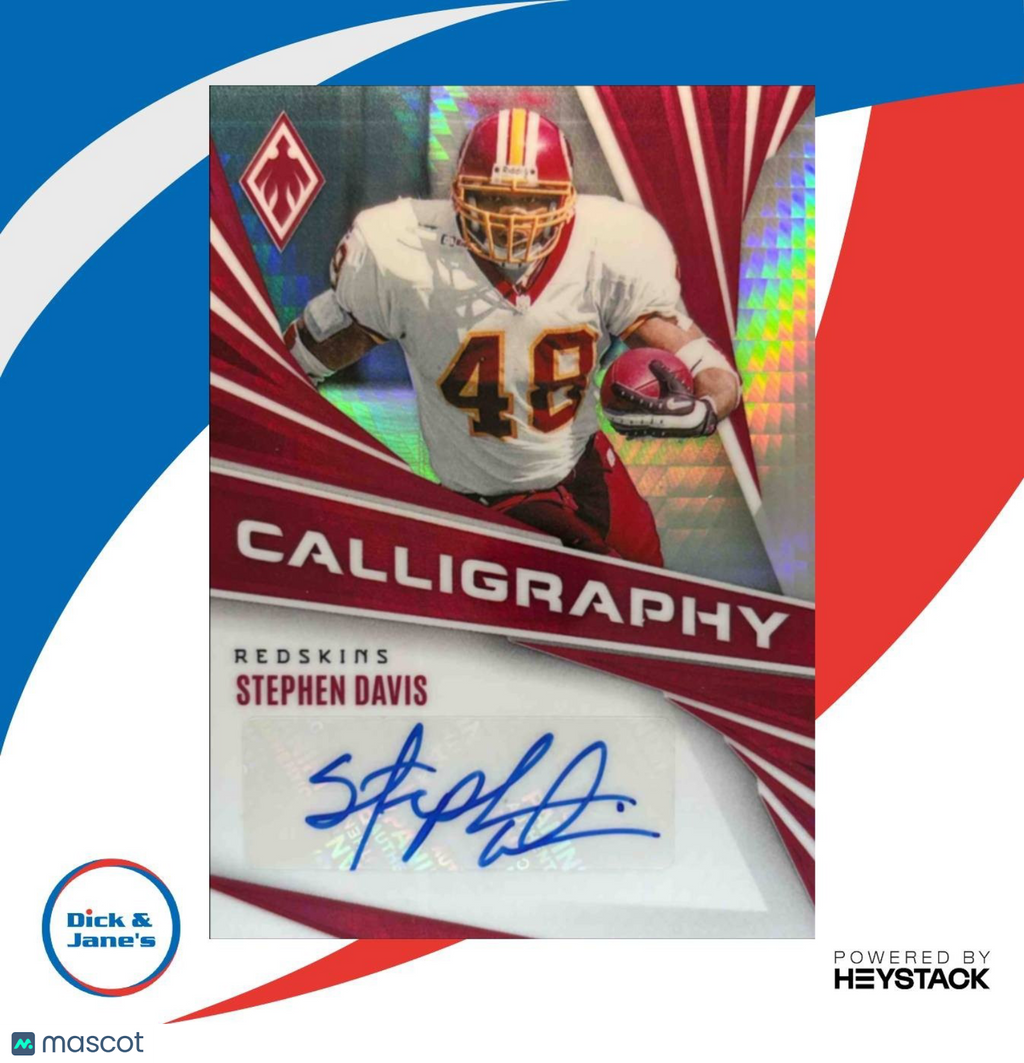 This rare 2024 Panini Phoenix Stephen Davis Calligraphy #C-SDS Auto card is a must-have for any Washington Redskins fan. Featuring an authentic autograph from the NFL player himself, this collectible card is sure to be a prized possession in any sports card collection. Don't miss your chance to own a piece of football history! Listed With Mascot.