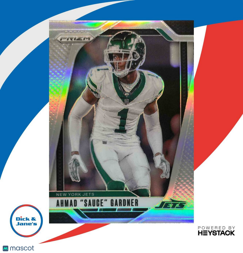 The 2024 Panini Prizm Ahmad Sauce Gardner Silver #226 New York Jets trading card is a must-have for any NFL collector. This rare silver edition features the star cornerback in his iconic Jets uniform. Don't miss your chance to own a piece of football history with this highly coveted card. Get it now before it's gone! Listed With Mascot.