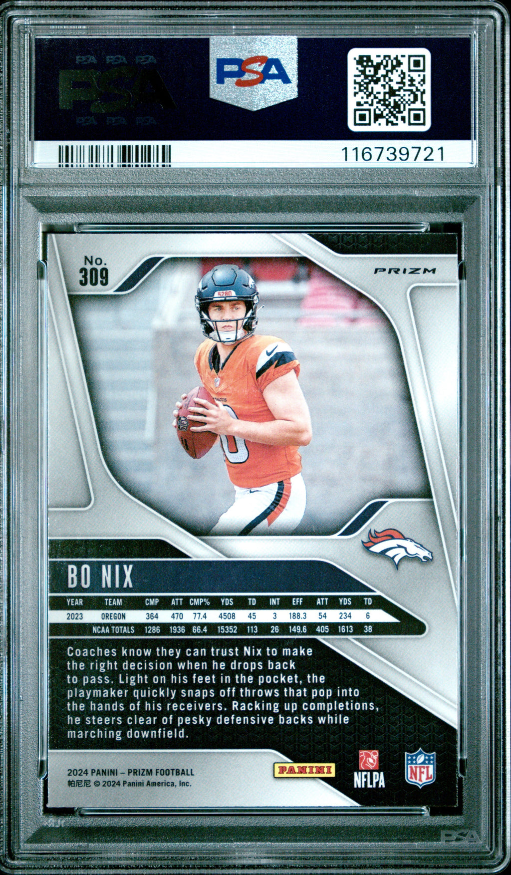 You are purchasing the following: 2024 Panini Prizm Bo Nix Disco Rookie #309 PSA 9 Denver Broncos. You will receive the exact item in the photographs. Note: Please do not connact us and asking the following: 1. What is the lowest you would take? Just make an offer. If the offer is automatically declined, you have your answer. 2. What the best you can do? See above. Not repling to an email is a reply. 3. Any room on this? See above. Not repling to an offer is a reply. 4. We ONLY do one counter offer, so please make your best offer the first time! Note: If the price off, in your option, please send your resaoning and an offer. We will review it. Note: We manage nearly 10 millon cards regularly and will adjust prices as errors are noticed or pointed out! Listed With Mascot.