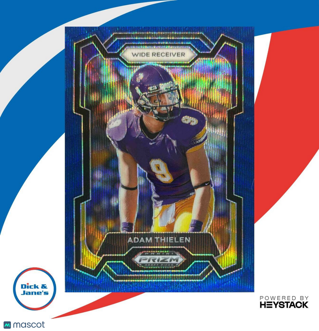This 2024 Panini Prizm Collegiate Draft Picks card features NFL star Adam Thielen in a striking Blue Wave parallel design. Limited to just 249 copies, this rare card is a must-have for any serious collector or fan of the Minnesota Vikings receiver. Don't miss your chance to own a piece of football history! Listed With Mascot.