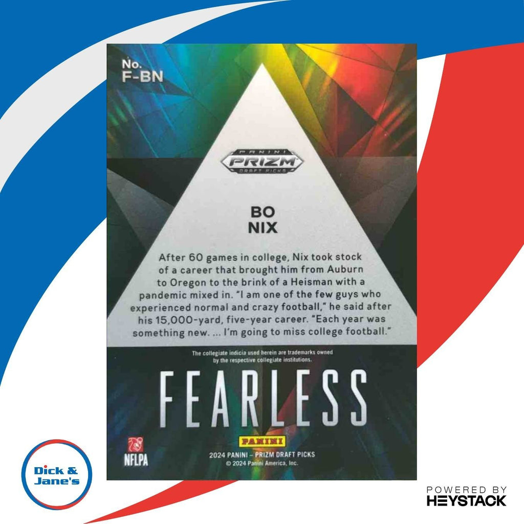2024 Panini Prizm Collegiate Draft Picks Bo Nix Fearless #F-BN RC Oregon Ducks. This NCAAF card features the rookie debut of talented quarterback Bo Nix in his new uniform with the Oregon Ducks. A must-have for any collector looking to invest in the future star of the game. Listed With Mascot.