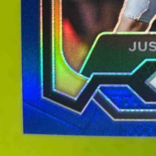 The 2024 Panini Prizm Collegiate Draft Picks Justin Herbert Blue /199 #69 Ducks is a highly collectible NCAAF card featuring the star quarterback from the University of Oregon. Limited to only 199 copies, this card showcases Herbert in his collegiate uniform and is a must-have for any football card collector. Don't miss out on adding this rare and valuable card to your collection today! Listed With Mascot.