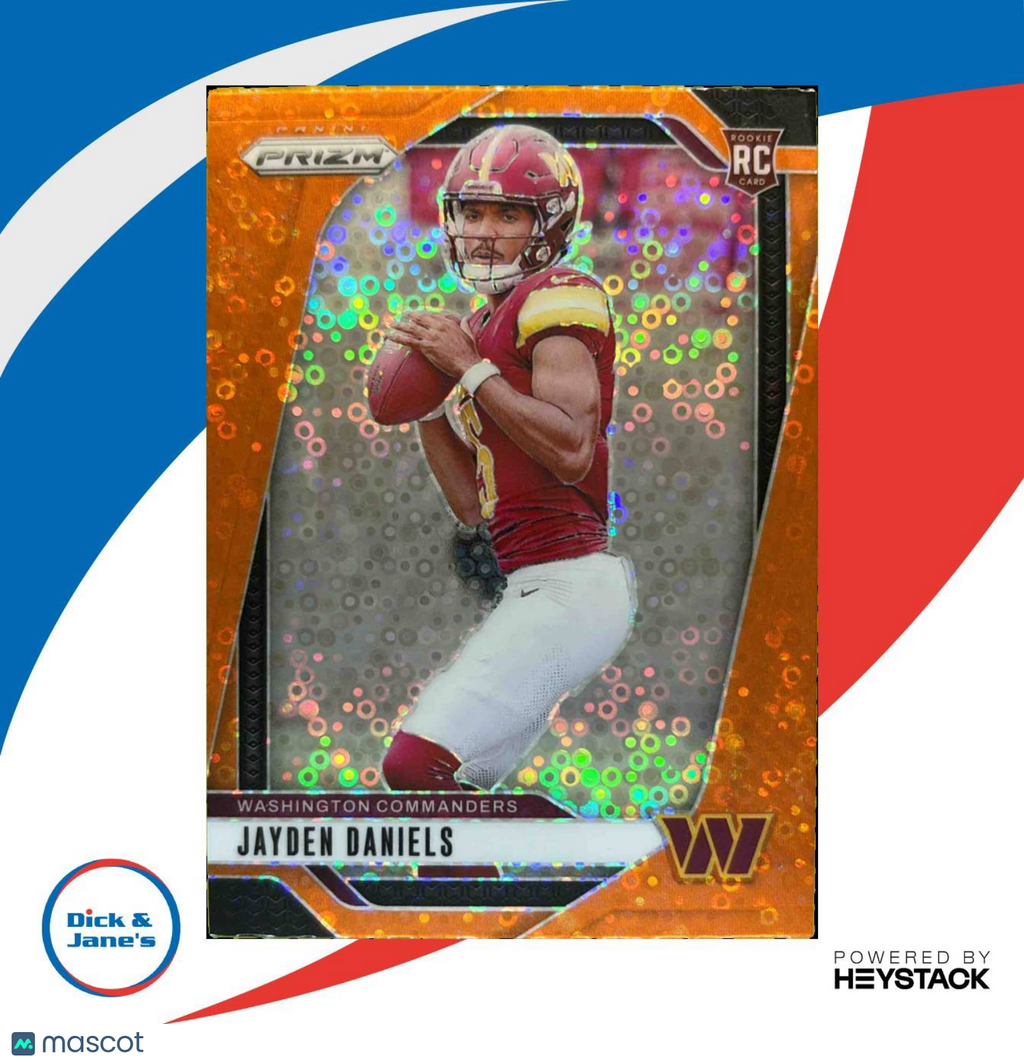 : This limited edition 2024 Panini Prizm Jayden Daniels Orange Disco #347 RC trading card showcases the rising star quarterback for the Washington Commanders in the NFL. A must-have for collectors, featuring a vibrant orange design and rookie card status, sure to be a valuable addition to any sports memorabilia collection. Listed With Mascot.