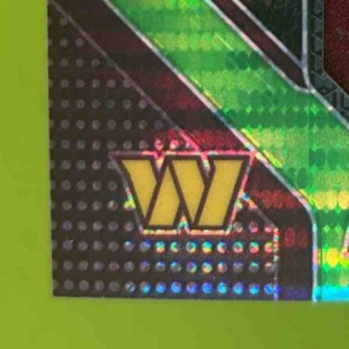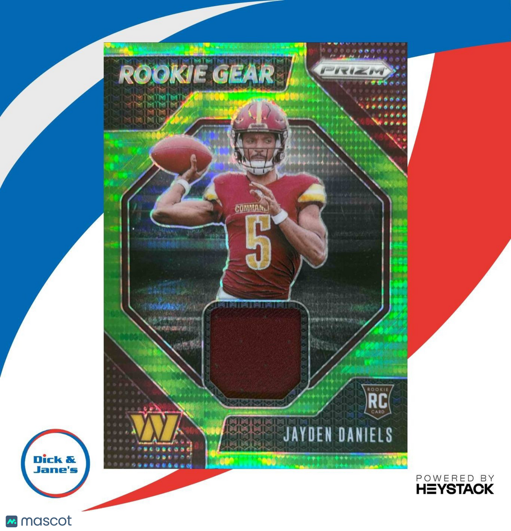 This rare 2024 Panini Prizm Jayden Daniels Rookie Gear Green Pulsar MEM RC Commanders sports trading card features an authentic piece of game-worn memorabilia. A must-have for any NFL fan looking to add a unique and valuable item to their collection. Get your hands on this rookie card before it's gone! Listed With Mascot.