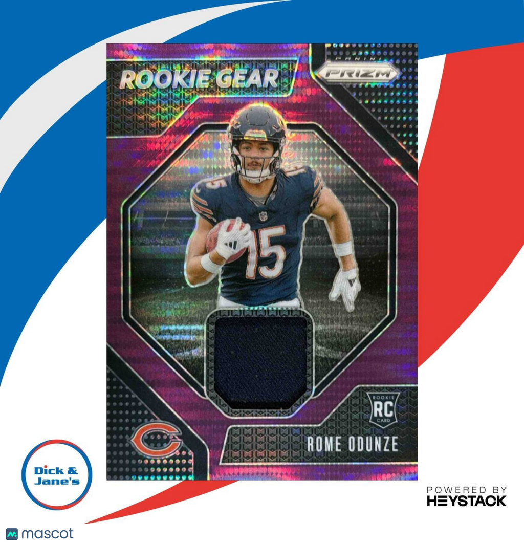Collect the 2024 Panini Prizm Rome Odunze Rookie Gear Purple Pulsar MEM RC Chicago Bears trading card! This rookie card features an exclusive memorabilia patch and a stunning design. Get your hands on this limited edition NFL card before it's gone! Listed With Mascot.