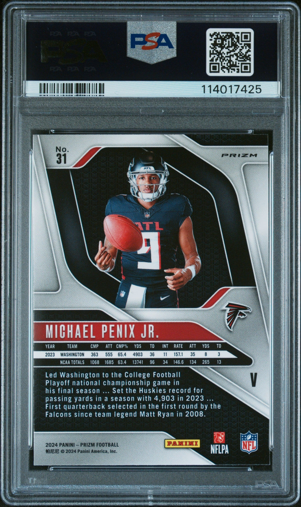 You are purchasing the following: 2024 Panini Prizm Rookie Variation Michael Penix JR. #31 PSA 10 . You will receive the exact item in the photographs. Note: Please do not connact us and asking the following: 1. What is the lowest you would take? Just make an offer. If the offer is automatically declined, you have your answer. 2. What the best you can do? See above. Not repling to an email is a reply. 3. Any room on this? See above. Not repling to an offer is a reply. 4. We ONLY do one counter offer, so please make your best offer the first time! Note: If the price off, in your option, please send your resaoning and an offer. We will review it. Note: We manage nearly 10 millon cards regularly and will adjust prices as errors are noticed or pointed out! Listed With Mascot.